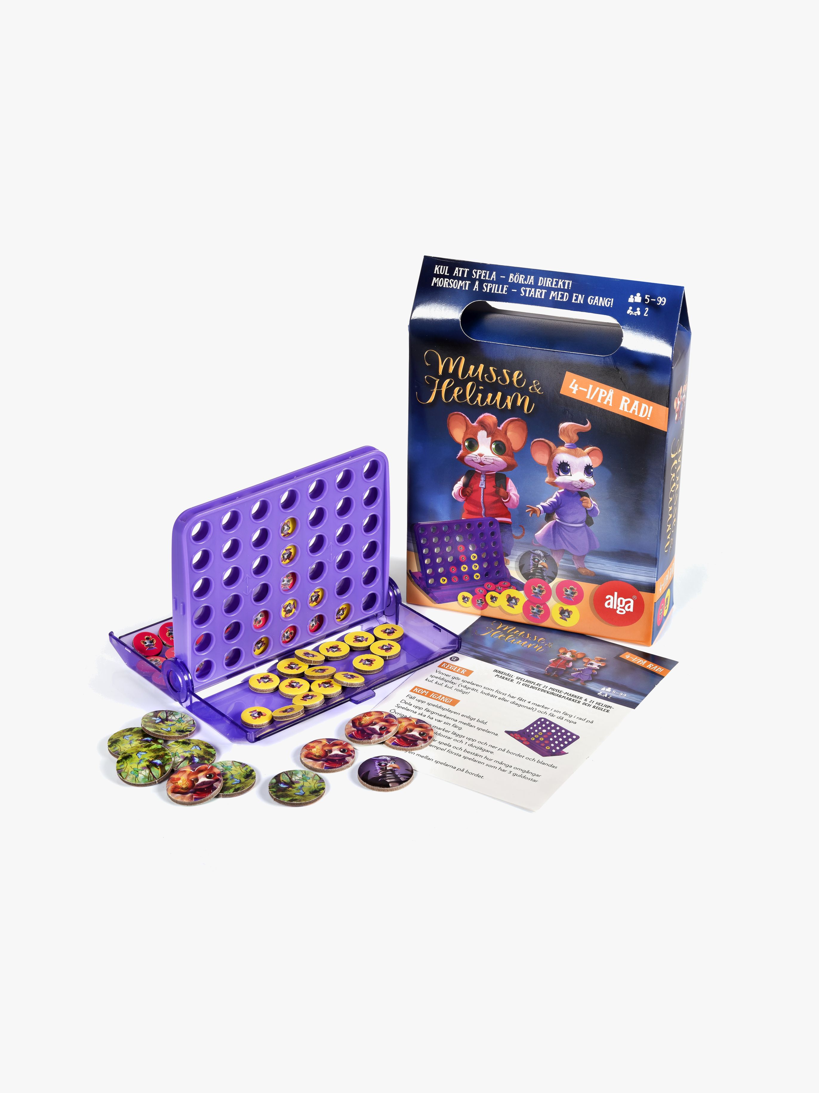 4-i-rad från Alga med ett lekfullt Musse & Helium-motiv. 4-i-rad är ett av Musse & Heliums favoritspel. Bestäm vem som börjar och lägg sedan varannan marker och försök få 4-i rad. Det kanske ser lätt ut men du ska se att det är lite knepigt. Ska det bli du eller kompisen som vinner? Guldostar ligger i potten! Men se upp för Duvjägarna, kanske tar de vinsten ifrån dig. - Innehåller: Speldisplay, spelbrickor, guldost/duvjägarmarker och regler. - CE-märkt. - Rekommenderad ålder: Från 5 år.