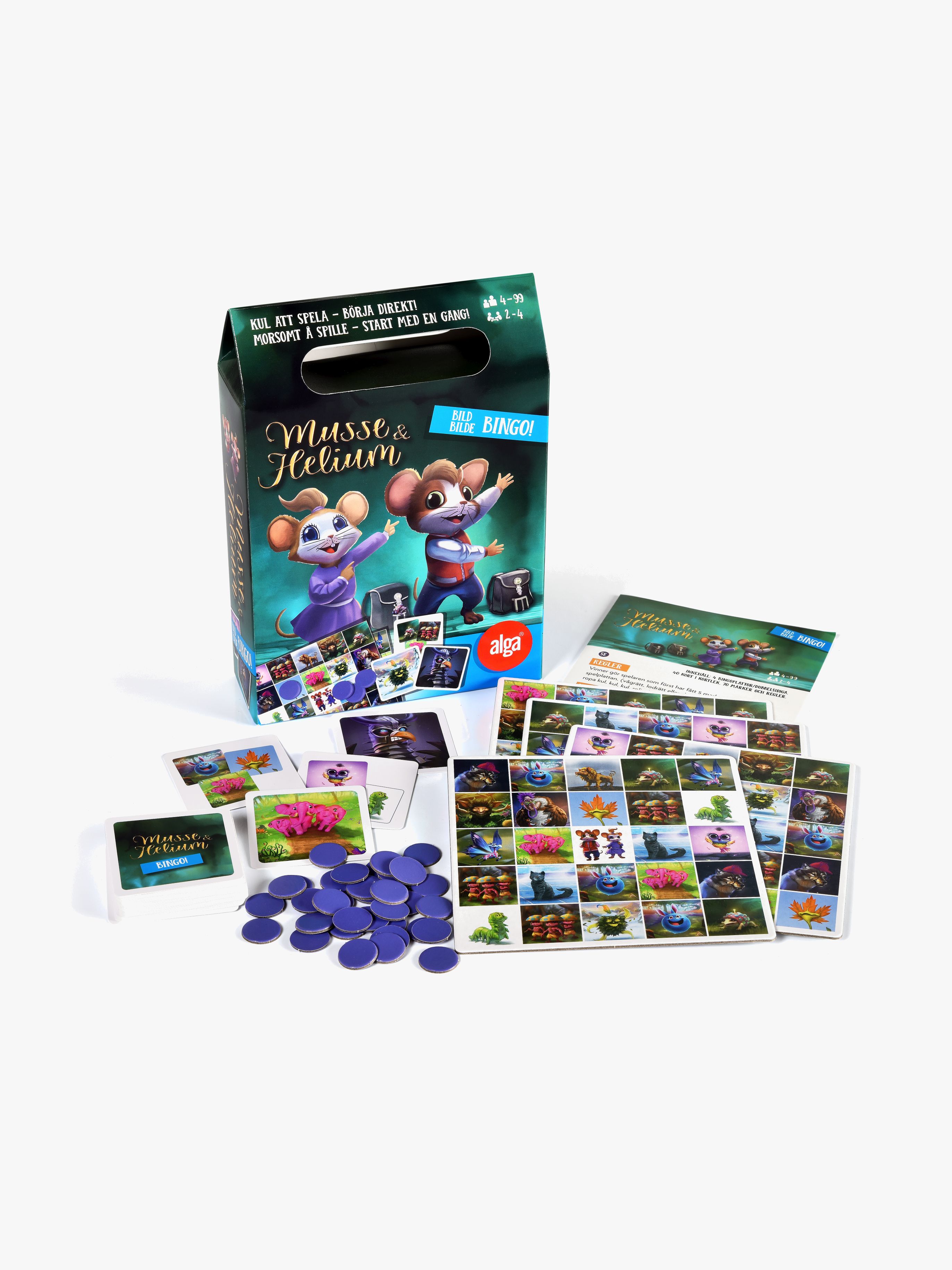 Bildbingo från Alga med ett lekfullt Musse & Helium-motiv. Perfekt för många roliga spelstunder. Fem i rad, hurra! Spela Musse & Heliums bingospel, ett litet annorlunda speläventyr där Duvjägarna kan ställa till det. Dra ett kort och se vilka rutor du får täcka men se som sagt upp för Duvjägarna. - Innehåller: Bingoplattor, kortlek, marker och regler. - CE-märkt. - Rekommenderad ålder: Från 4 år.