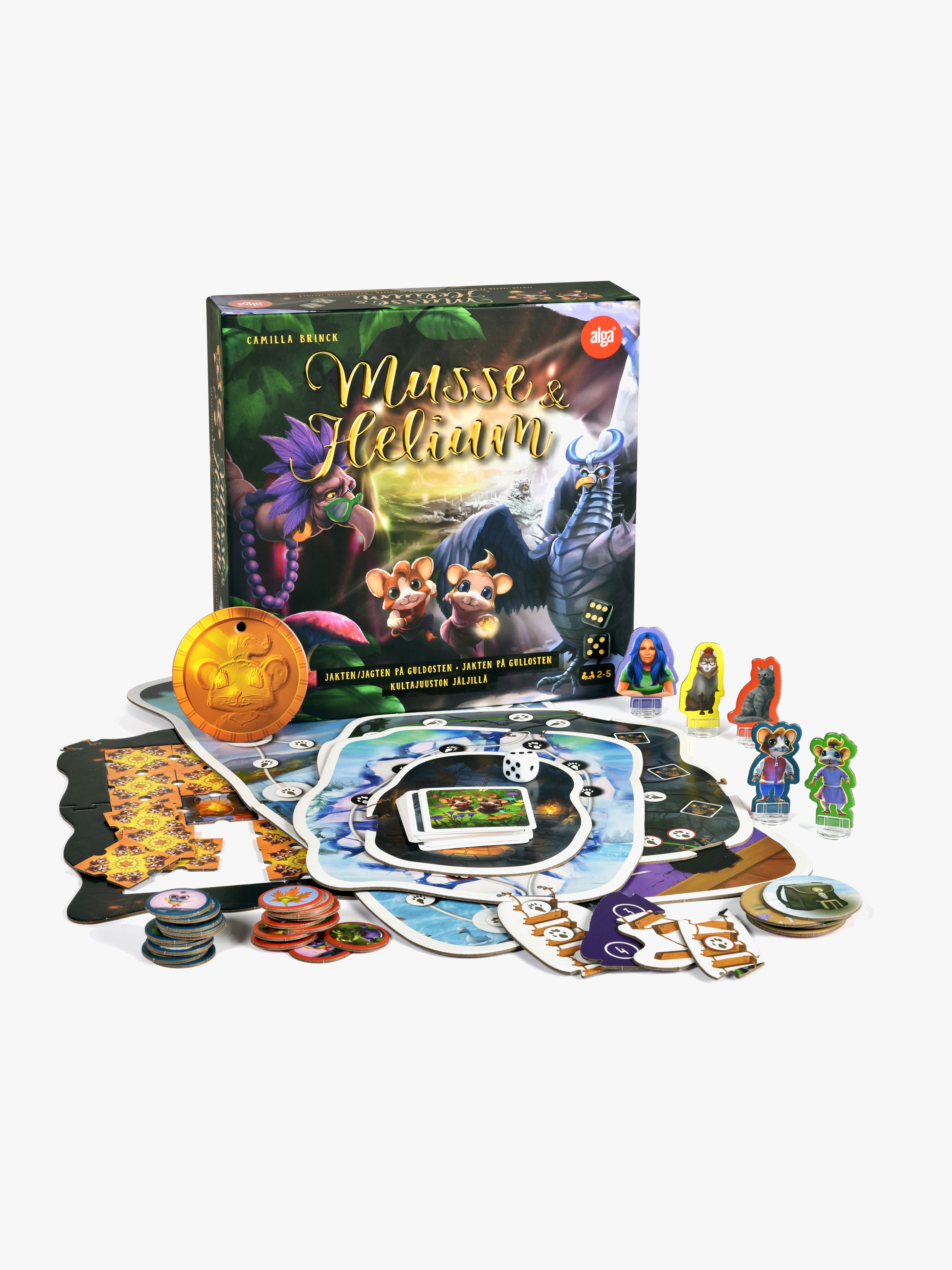 Camilla Brincks populära böcker finns även som spel. Stig in i Musses & Heliums fantastiska värld och hjälp dem i kampen mot de otäcka duvjägarna. Att hitta Guldosten och föra den i säkerhet kräver både mod, list och tur med tärningen. Ett härligt spännande och fantasifullt spel som tränar barnets koncentration och fokus. Roligt för skattletare i alla åldrar – både stora och små. Rekommenderad ålder från: 5 år.