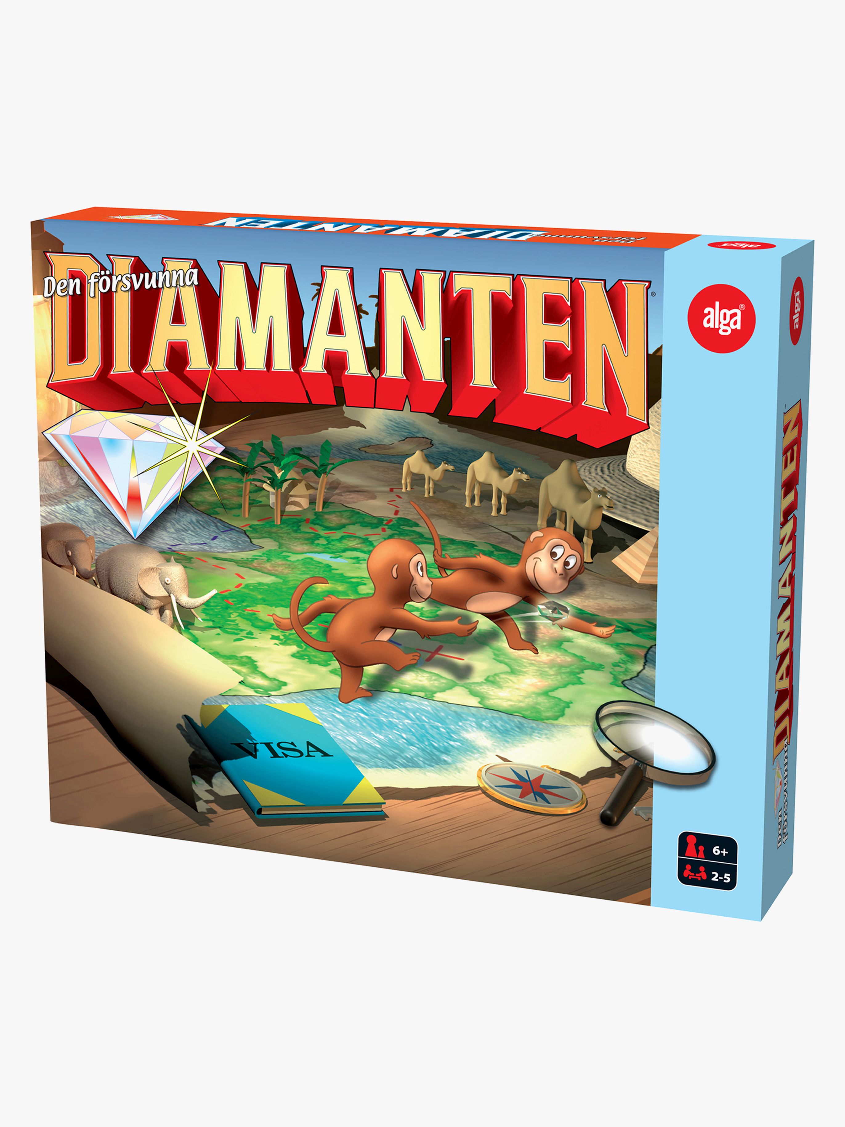 Alga Spel Den Försvunna Diamanten är ett roligt sällskapsspel som passar hela familjen! Spelet går ut på att du och dina motspelare letar er igenom hela Afrika, i jakten efter världens största diamant – Afrikas Stjärna. Detta familjespel har en speltid på ca 30 – 45 minuter och spelas av 2-5 spelare. Rekommenderad ålder: Från 6 år.