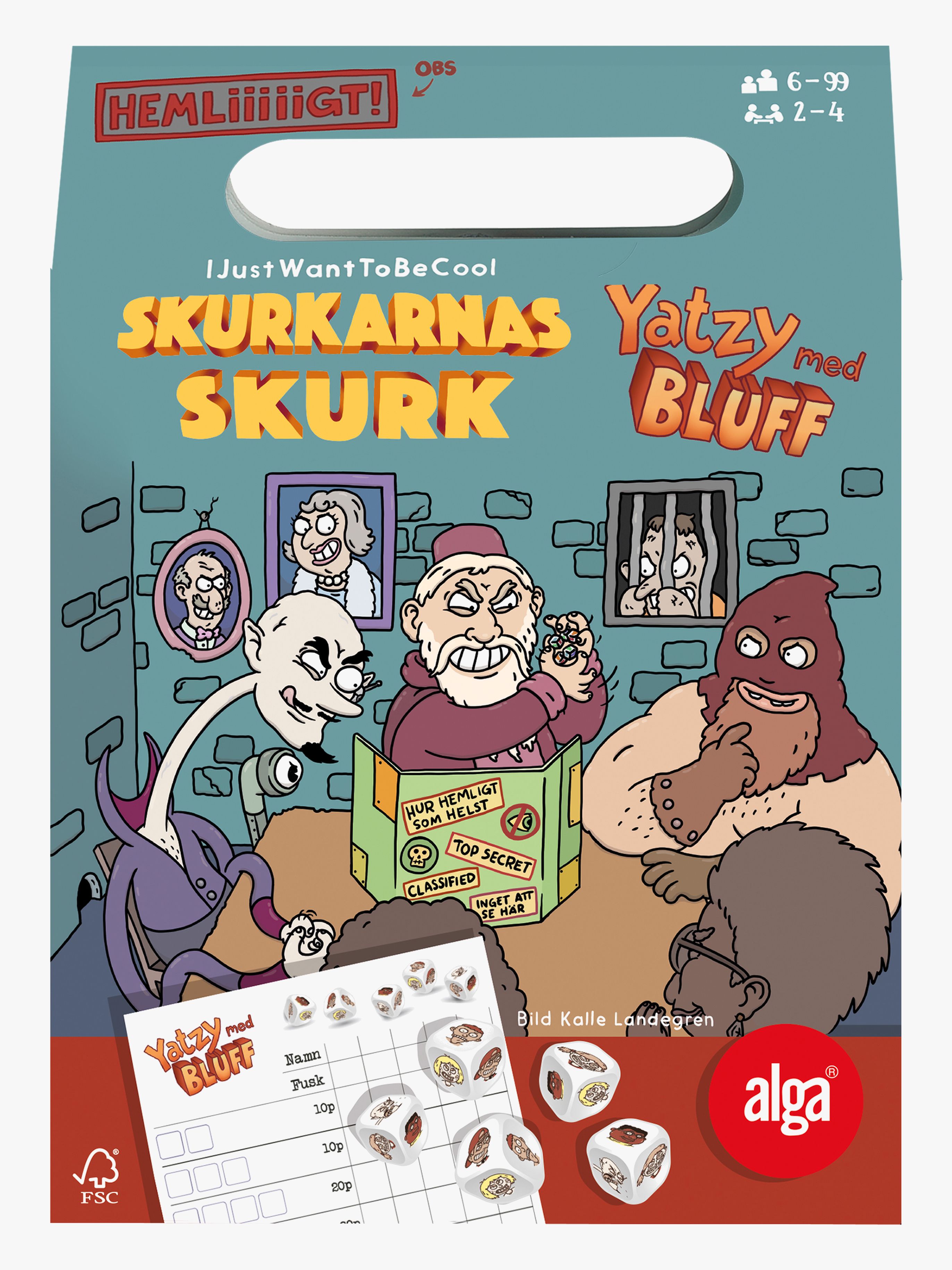 Yatzy från Alga med nya, roliga regler. Perfekt för hela familjen. - Skurkarna gillar att spela spel och att fuska! - Du kan fuska med tärningarna men samtidigt bli påkommen av en GLO-marker! - Lär dig bemästra när det är dags att fuska och lär dig ädla konsten att inte bli upptäckt! - CE-märkt. - Rekommenderad ålder: Från 6 år.