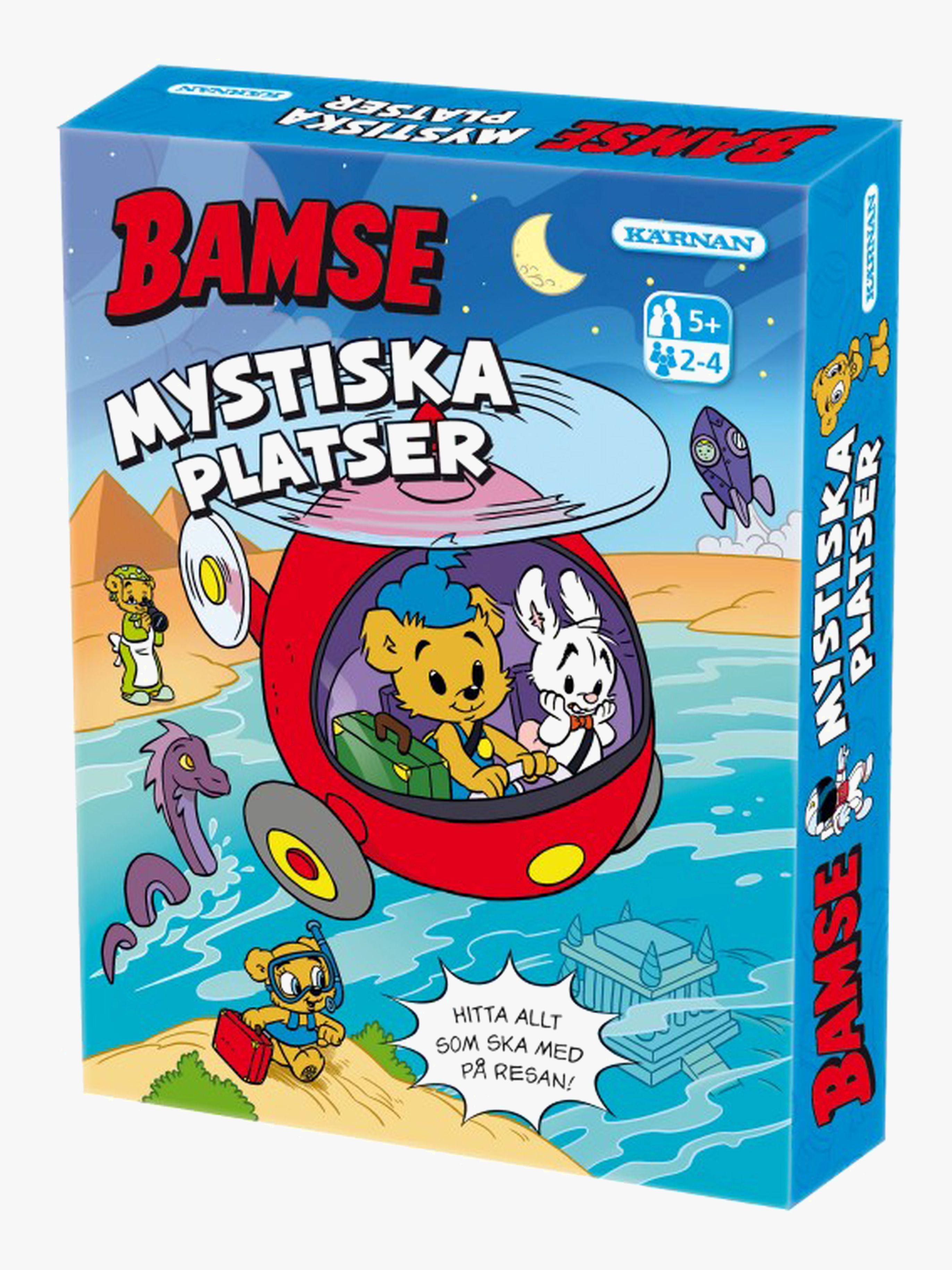 Spel från Bamse med enkla regler så alla kan vara med! Nalle Maja, Skalman, Farmor och Lille Skutt ska ge sig ut på äventyr och besöka pyramiderna, Atlantis, månen och Loch Ness-sjön. De behöver hjälp med att packa både sina egna saker och packning som är viktiga att få med sig till platsen dit de ska. De måste också hitta att ta sig dit på rätt sätt, med båt, ubåt, helikopter eller rymdraket. När resväskan är packad kan resan börja. Det gäller att få Bamse med sig som bäste resesällskap. Den som lyckas med det och först tar sig till sitt resmål har vunnit. Perfekt för många roliga spelstunde…