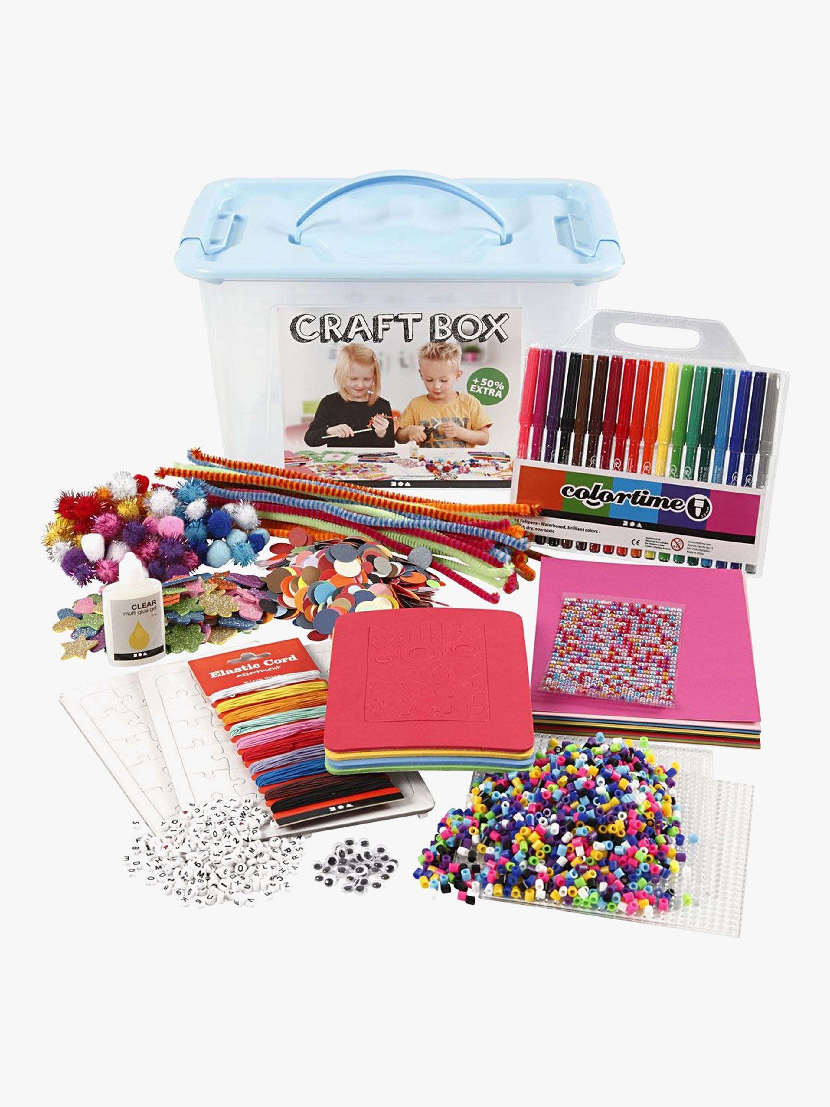 Låda med mängder av olika material till kreativa aktiviteter. Allt ligger i en förvaringslåda av plast med ett praktiskt handtag på locket, som sitter fast med clips. Innehåller: Kartong, kartongmosaik, tusch, lim, sax, elastiska snören, bokstavspärlor, rörpärlor, pärlplattor, pompomer, piprensare, pussel att rita på och rhinestones, rullögon och mossgummifigurer som alla är självhäftande samt inspirationsark.
