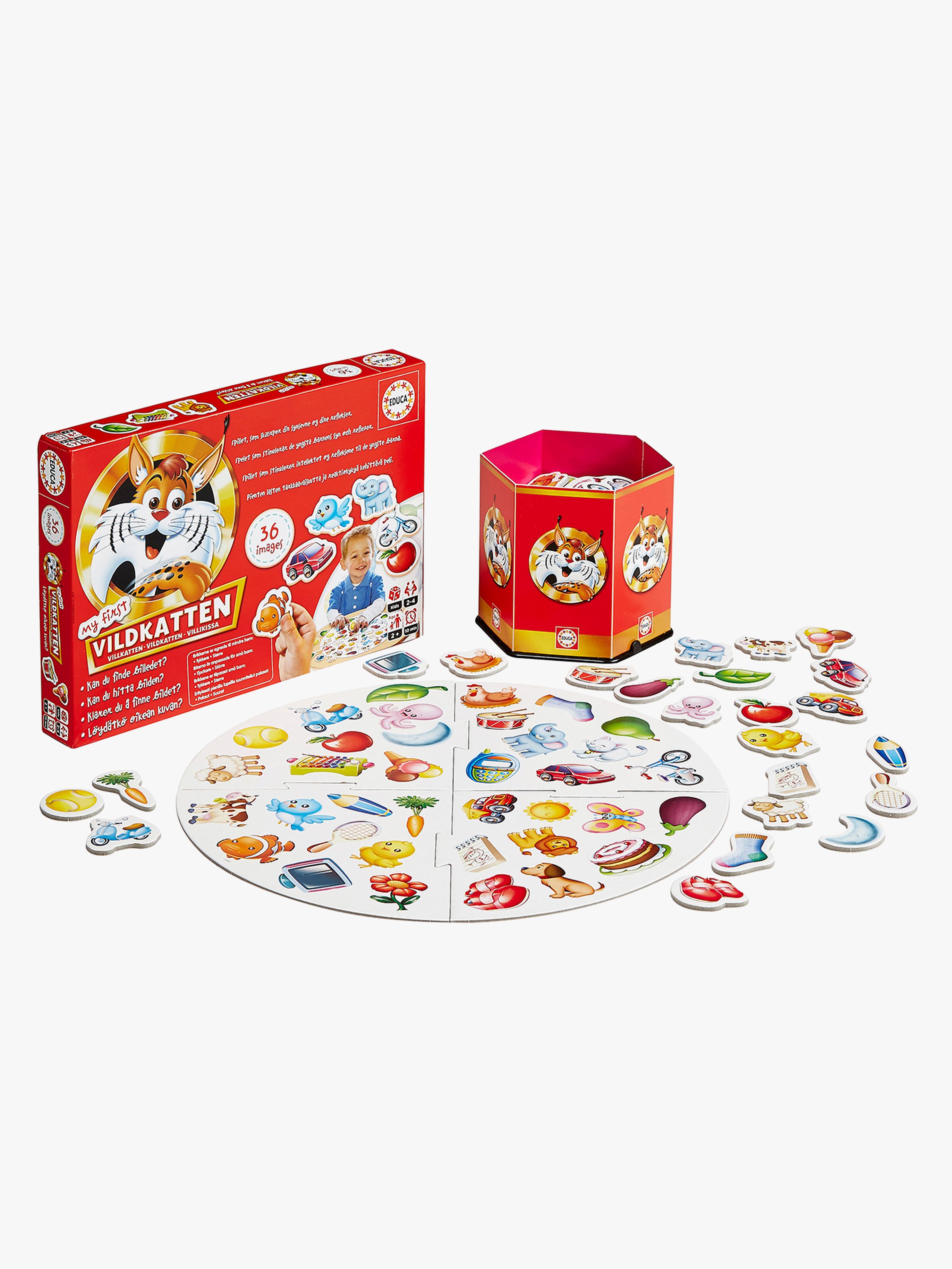 Kan du hitta bilden med Vildkatten är ett roligt sällskapspel för mindre barn från Educa. Vem hittar rätt bild på spelbrädet först? Spelet handlar om att vända ett bildkort och hitta motivet på spelbrädan så snart som möjligt. Detta kräver både överblick och koncentration. I spelet ingår 36 bildkort. Spelaren som får flest bildkort vinner spelet Rekommenderad ålder: Från 2 år.