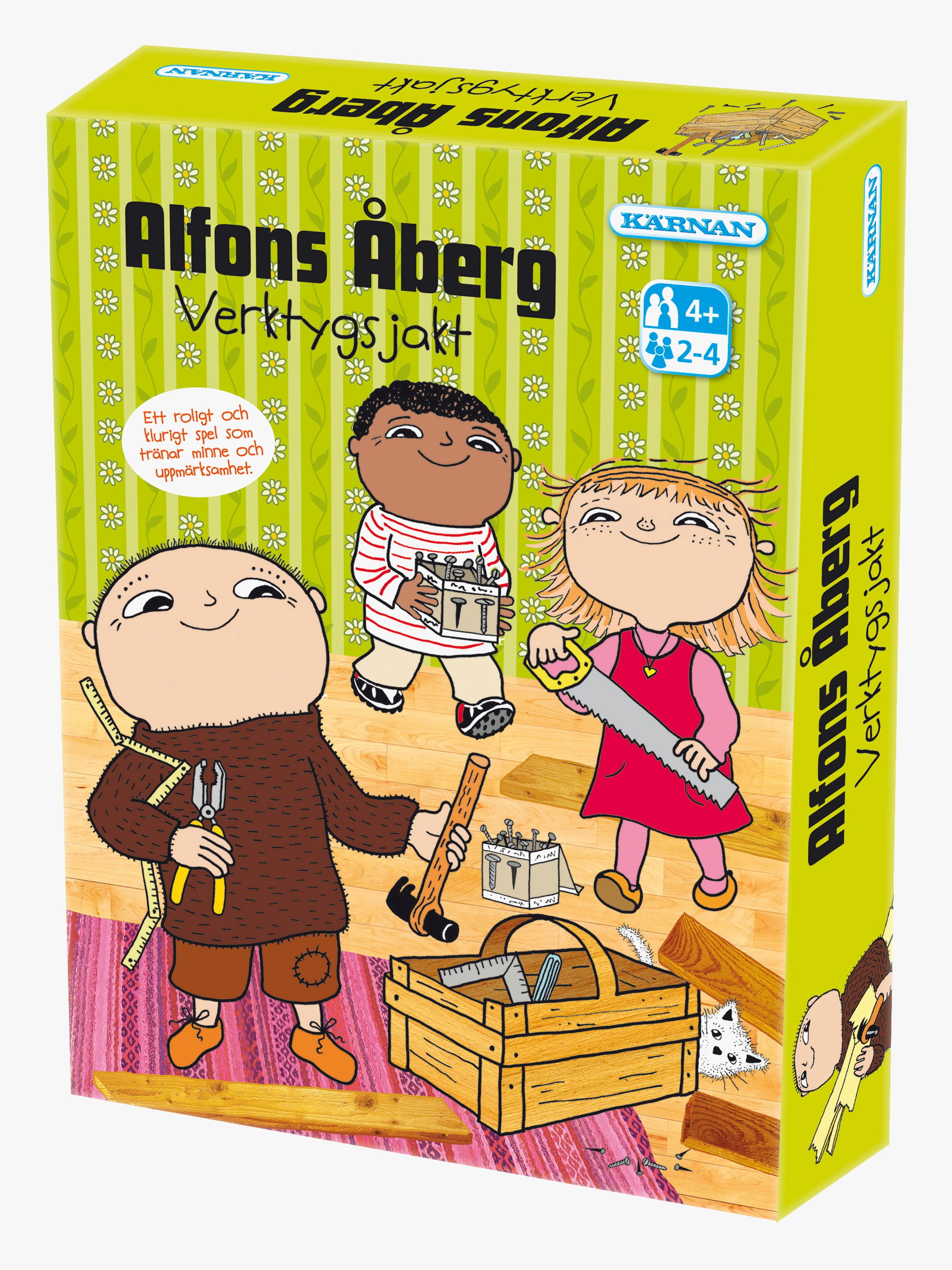 Roligt spel från Egmont Kärnan. Alfons verktygsjakt är ett roligt spel som tränar arbetsminnet hos de yngre barnen, och deras föräldrar. Det gäller att komma ihåg rätt verktyg, i rätt ordning samtidigt som man säger högt hur många brickor som vänds allteftersom. Den som blir först med att fylla sin bräda med rätt verktyg har vunnit spelet. Perfekt för hela familjen. - För 2-4 spelare. - Stimulerar barnets logik, finmotorik och hand-öga-koordination. - CE-märkt. - Rekommenderad ålder: Från 4 år.