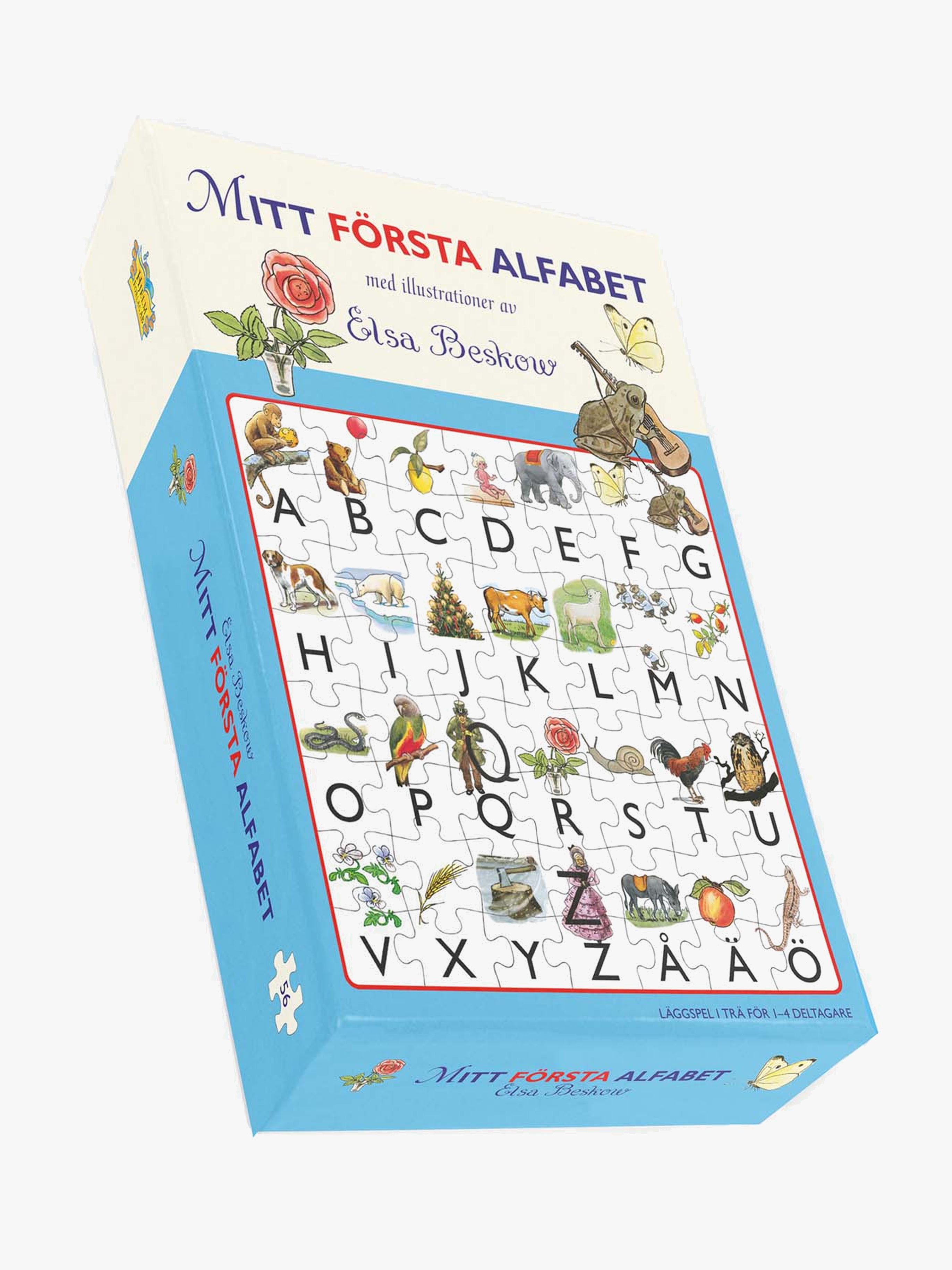 Mitt första Alfabetspussel är ett roligt pussel från Hjelm Förlag. Med detta fina pussel kan ditt barn pussla och lära sig alfabetet samtidigt. Pusslet innehåller 56 bitar i trä och har fina illustrationer av Elsa Beskow. - 56 bitar. Rekommenderad ålder: Från 2 år.