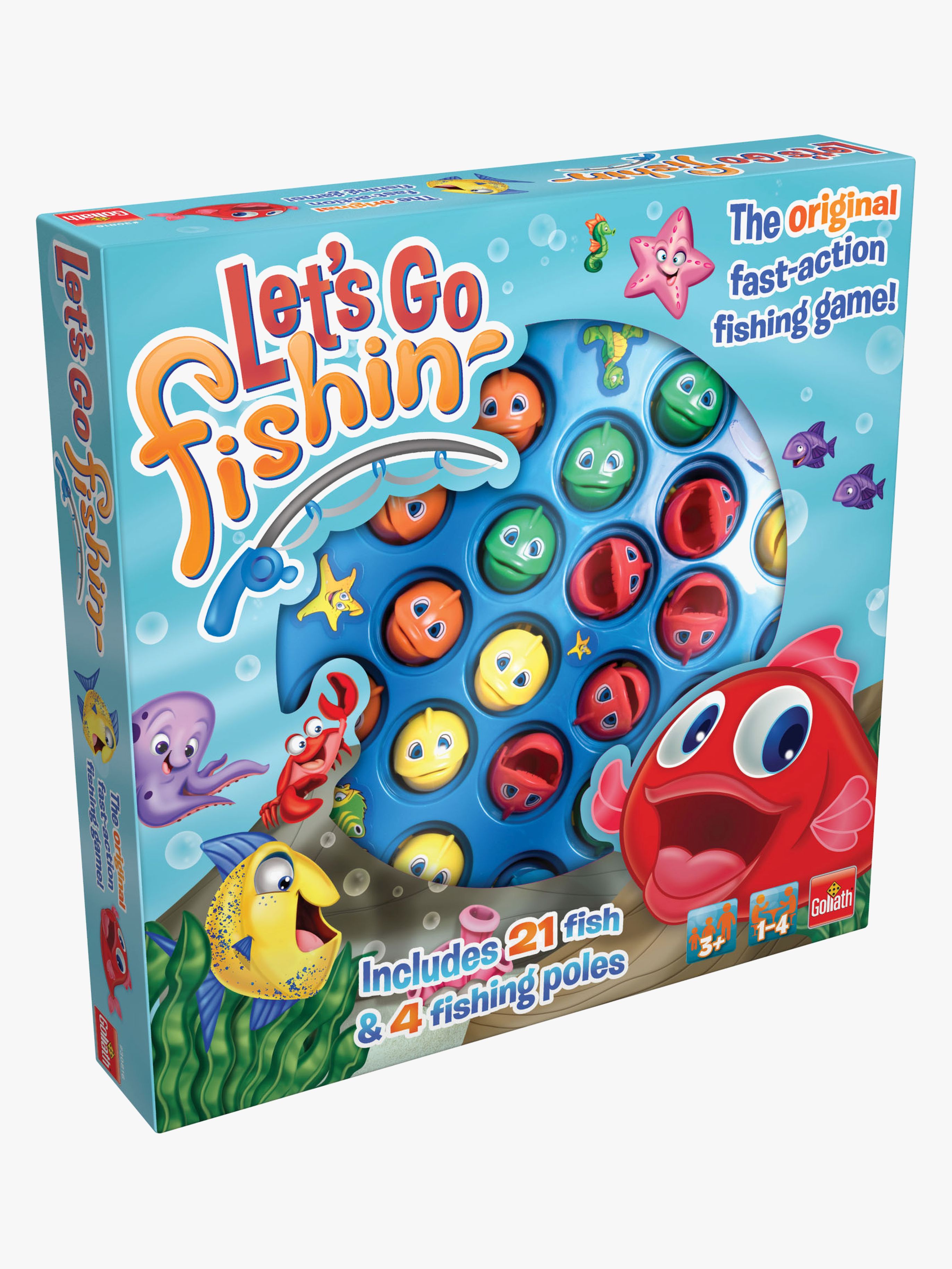 Roligt fiskespel från Goliath Games. Vem har bäst fiskelycka idag? Fånga fiskarna från det roterande spelbrädet. Den som fångar flest fiskar vinner. Perfekt för många roliga spelstunder. – Innehåller: 21 fiskar, 4 fiskespön. – CE-märkt. – Rekommenderad ålder: Från 3 år. – Batterier ingår ej.