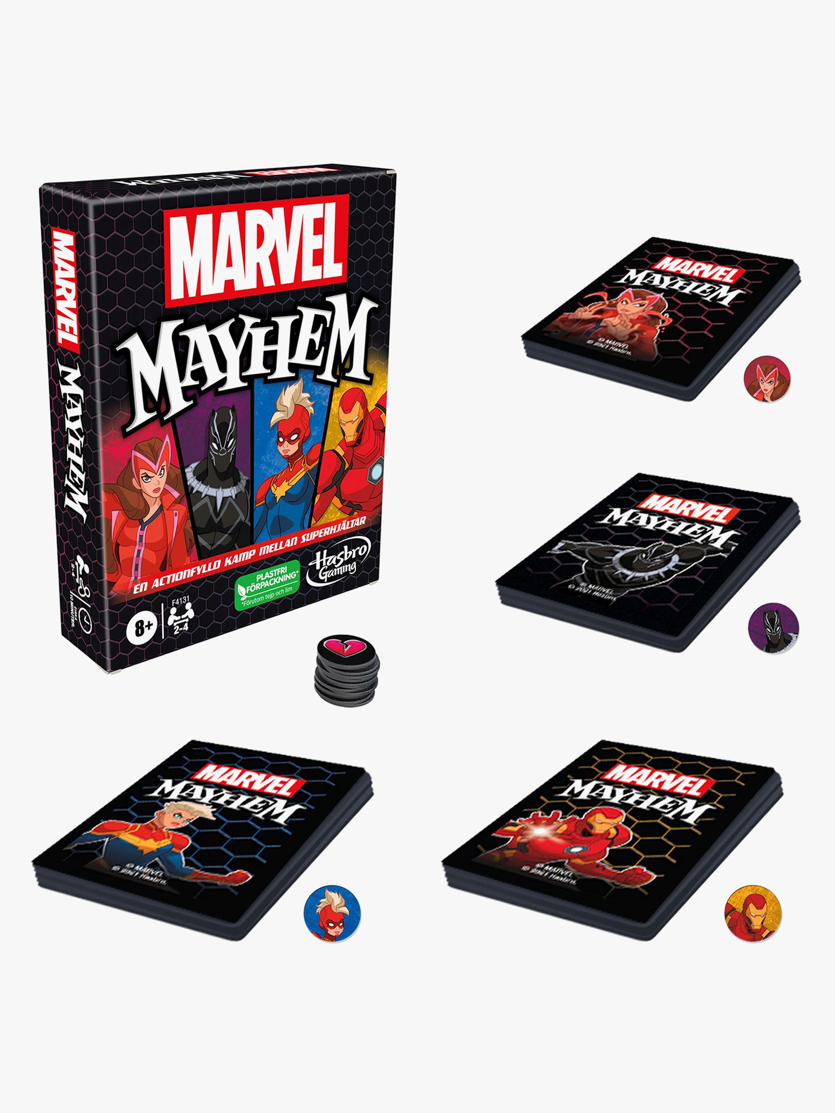 Spännande, häftig, flerfärgad Marvel Mayhem kortlek från Hasbro med marveltryck. Den är fartfylld och rolig. – Rekommenderad ålder: Från 8 år – ABS-plast, stål, PE, PP-plast