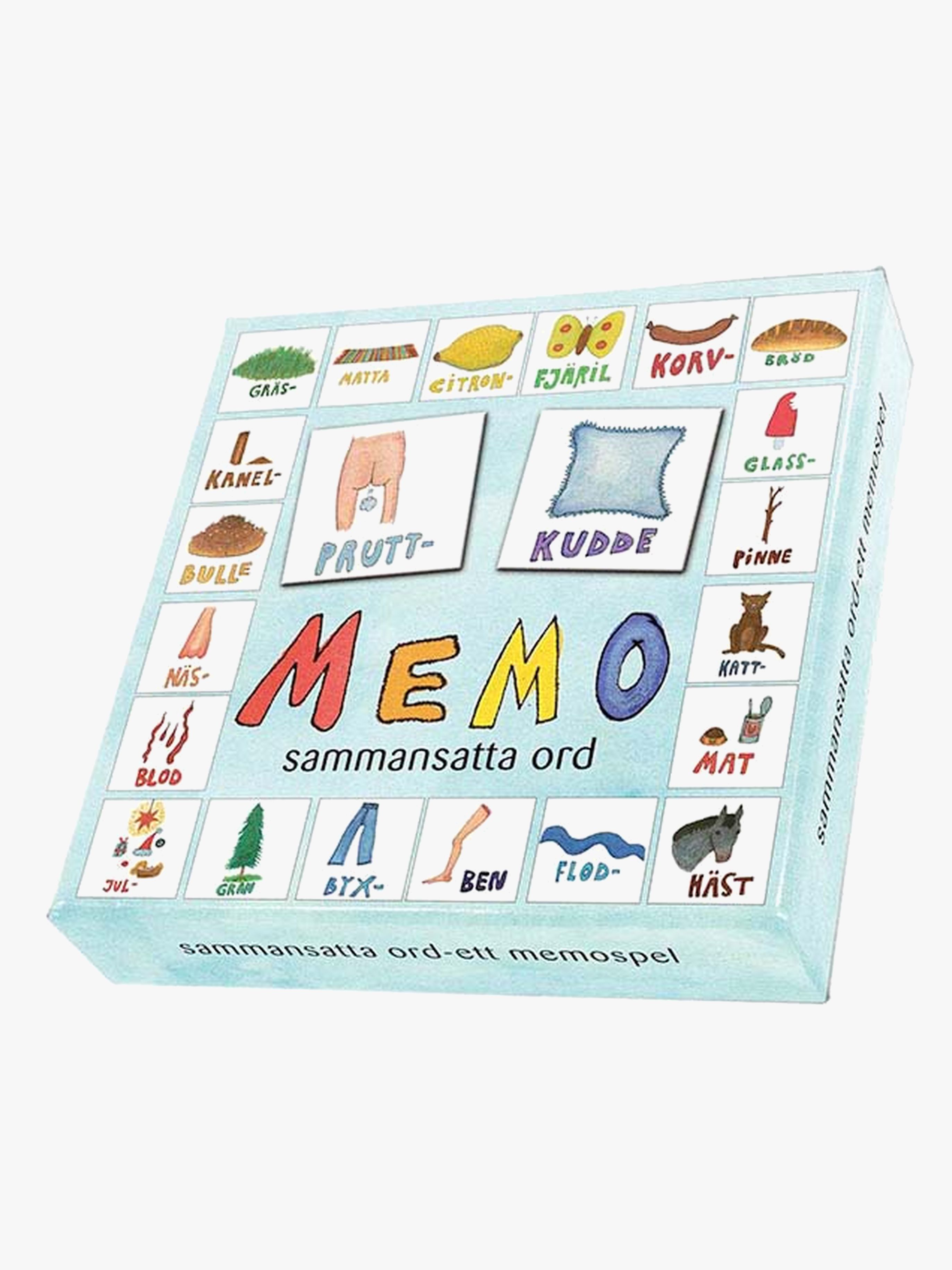 Ett roligt memo från Hjelm Förlag. Para ihop de matchande brickorna med varandra i detta roliga memospel. Försök att hitta två brickor som tillsammans bildar ett sammansatt ord. Här finns bland annat oväntade och roliga ord som prutt-kudde, kanel-bulle, korv-bröd, flod-häst och glas-ögon. Ett nytt roligt sätt att spela memo på! Rekommenderad ålder: Från 2 år.