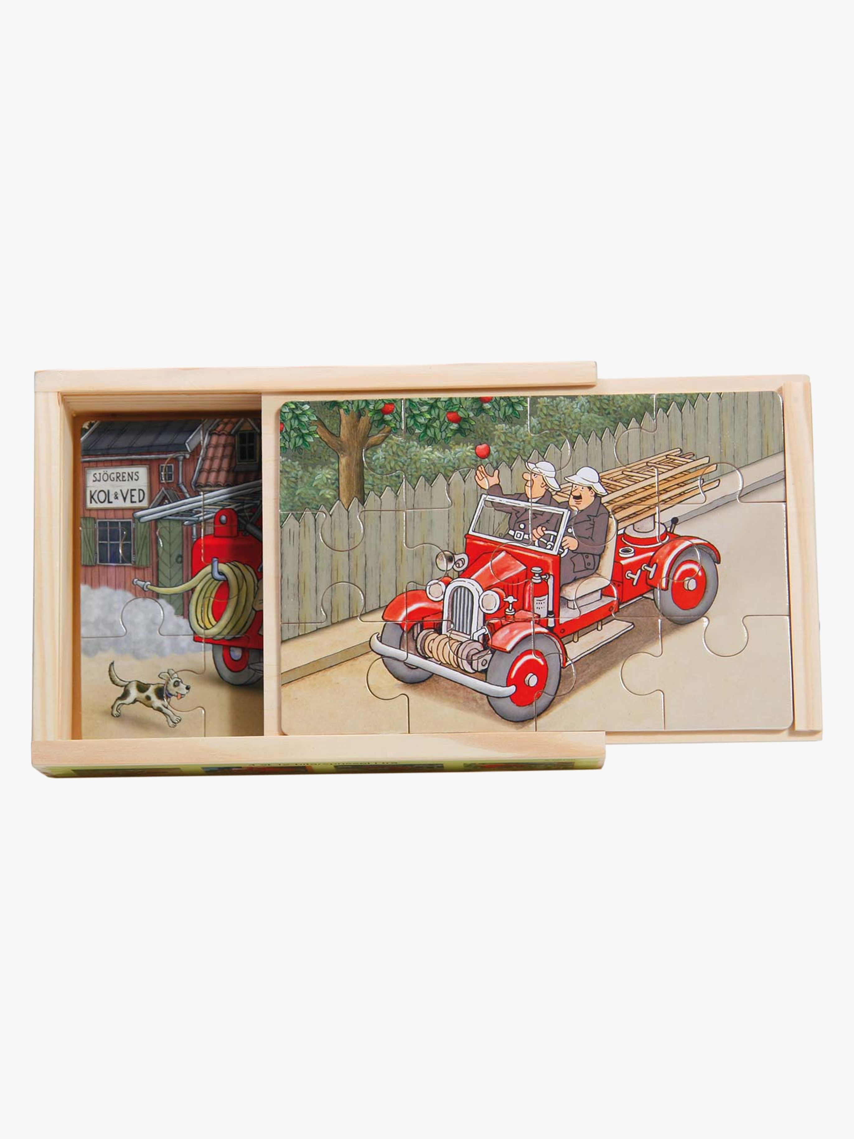 En fin låda med fyra pussel från Hjelm Förlag. Denna fina trälåda innehåller fyra pussel på tolv bitar vardera med motiv av Jan Lööf. Bitarna är tillverkade i trä och tillsammans bildar de roliga motiv av brandbilar. - 4x12 bitar Rekommenderad ålder: Från 2 år.