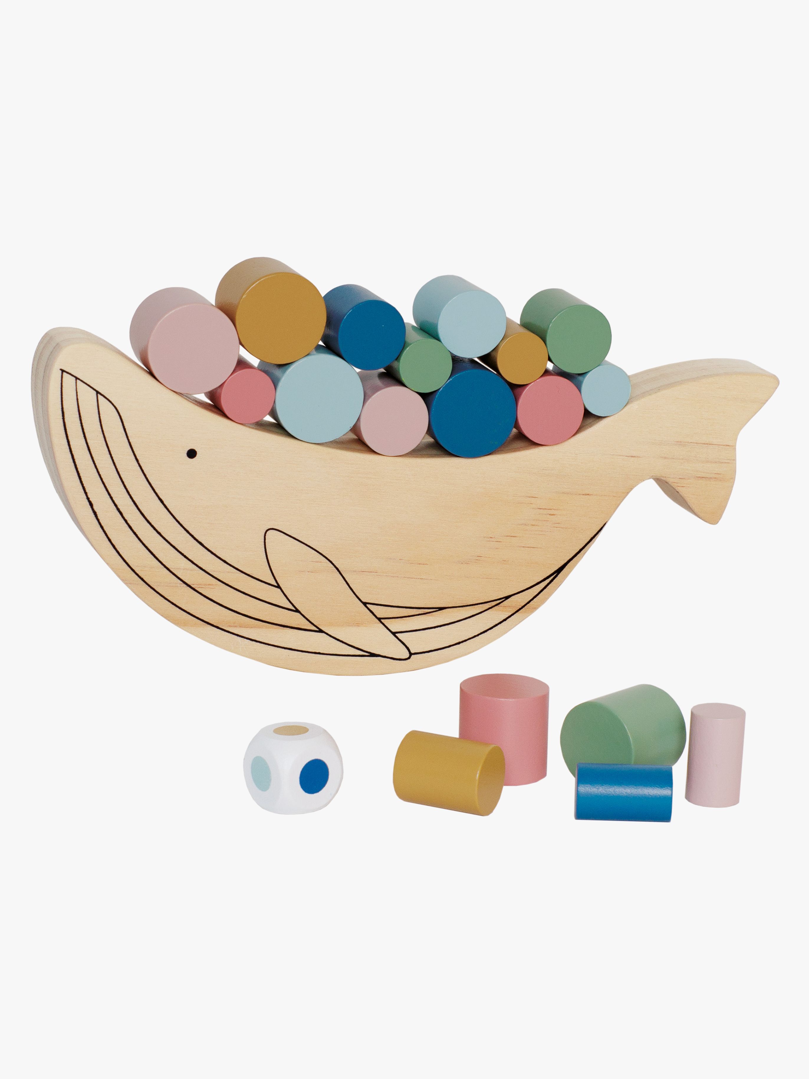Balansspel från Jabadabado med en lekfull design. Det har en valform och 18 små träklossar i olika storlekar och färger. Spelet går ut på att försöka lägga så många träklossar som möjligt på valens rygg utan att den tippar över åt endera håll. Slå tärningen, välj motsvarande färg på en kloss, och lägg klossen på valens rygg. Om någon kloss trillar av valen eller om den tippar har man förlorat. - CE-märkt. - Innehåller: 1 val, 18 träklossar, 1 tärning. - Rekommenderad ålder: Från 3 år. - Trä.