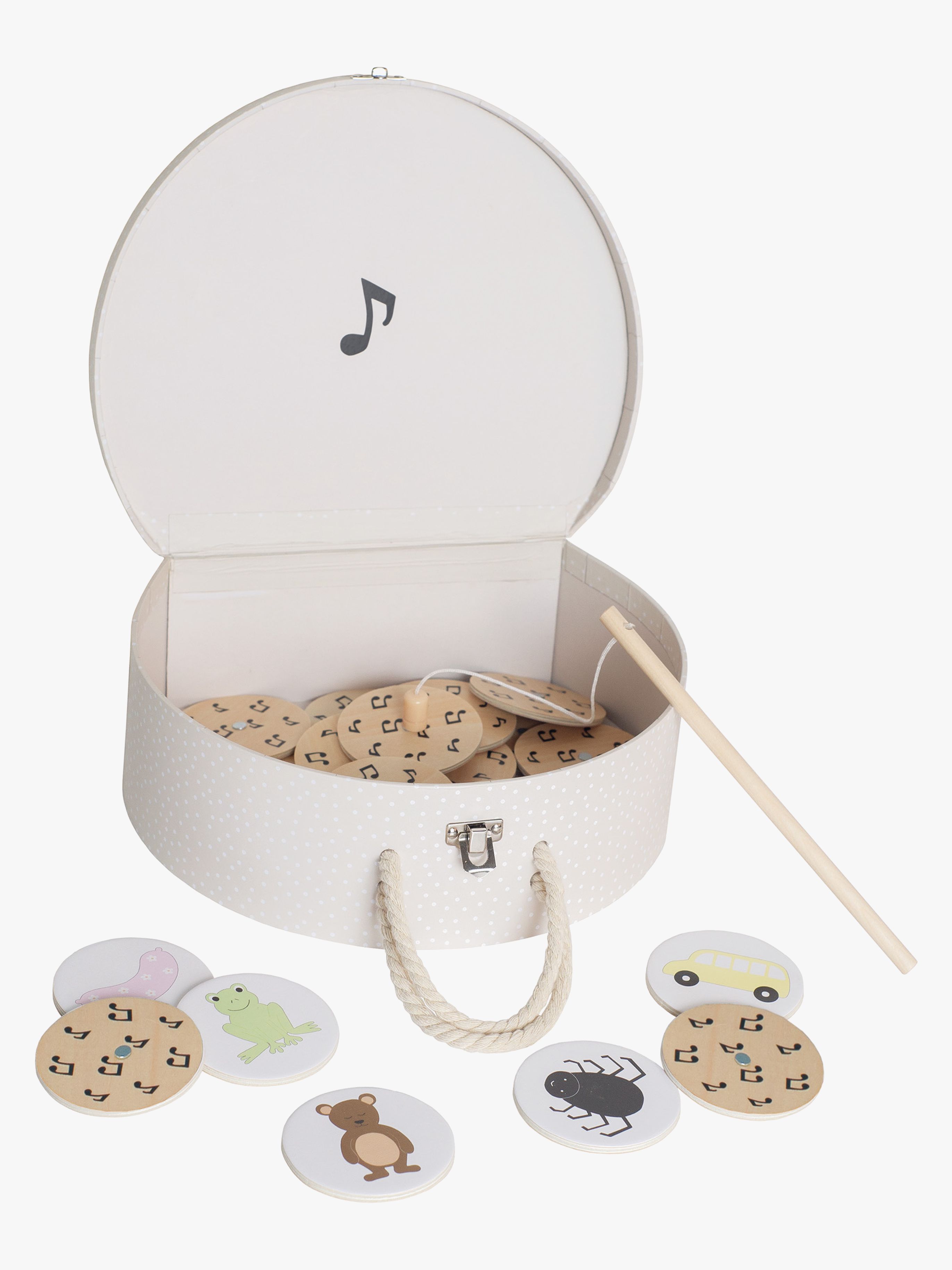 Sångväska från Jabadabado med ett fiskespö med en magnet. Den har 23 sångkort med olika barnvisemotiv. Perfekt för många mysiga och underhållande stunder tillsammans. Använd det lilla fiskespöet för att fiska upp ett sångkort och sjung sedan visan som passar ihop med bilden. - CE-märkt. - Innehåller: 1 väska, 23 sångkort, 1 fiskespö. - Rekommenderad ålder: Från 3 år.