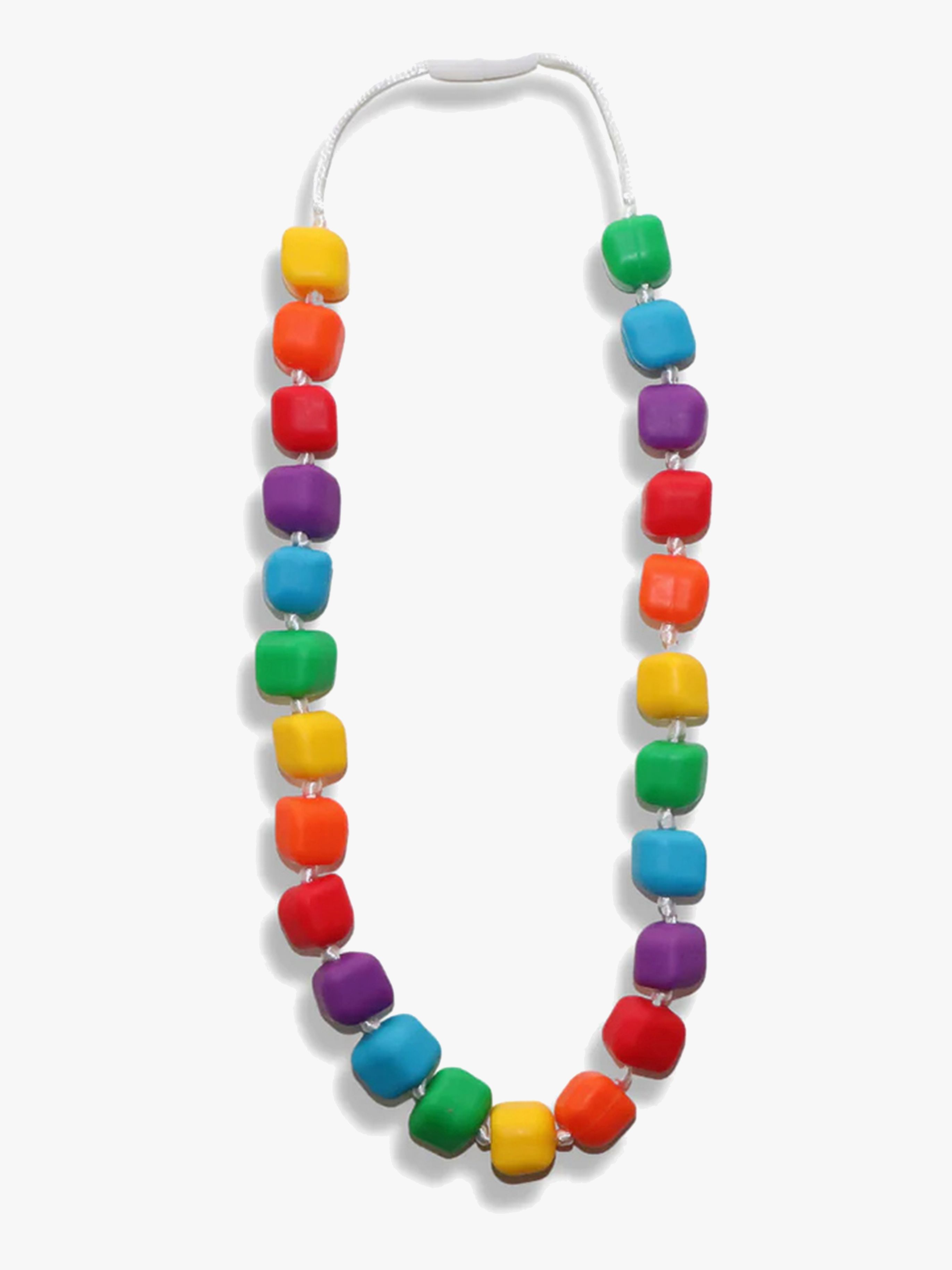 Tugghalsband från Jellystone Designs med en lekfull design i fina färger. Perfekt som accessoar och som ett sensoriskt hjälpmedel. - Består av 26 organiskt formade fyrkantiga pärlor. - En accessoar och ett sensoriskt redskap i ett. - Säkert för barn att tugga på och omdirigera sin uppmärksamhet från att tugga fingrar, naglar, hår, pennor etc. - Spänne som separeras lätt när man drar. - BPA, ftalat, PVC, kadmium och blyfritt. - Tvättbart. - Man behöver själv uppskatta barnets tuggbehov. För barn med stort tuggbehov så är ”Firm” det halsband man ska välja. För mindre tuggbehov kan man nöjas med…