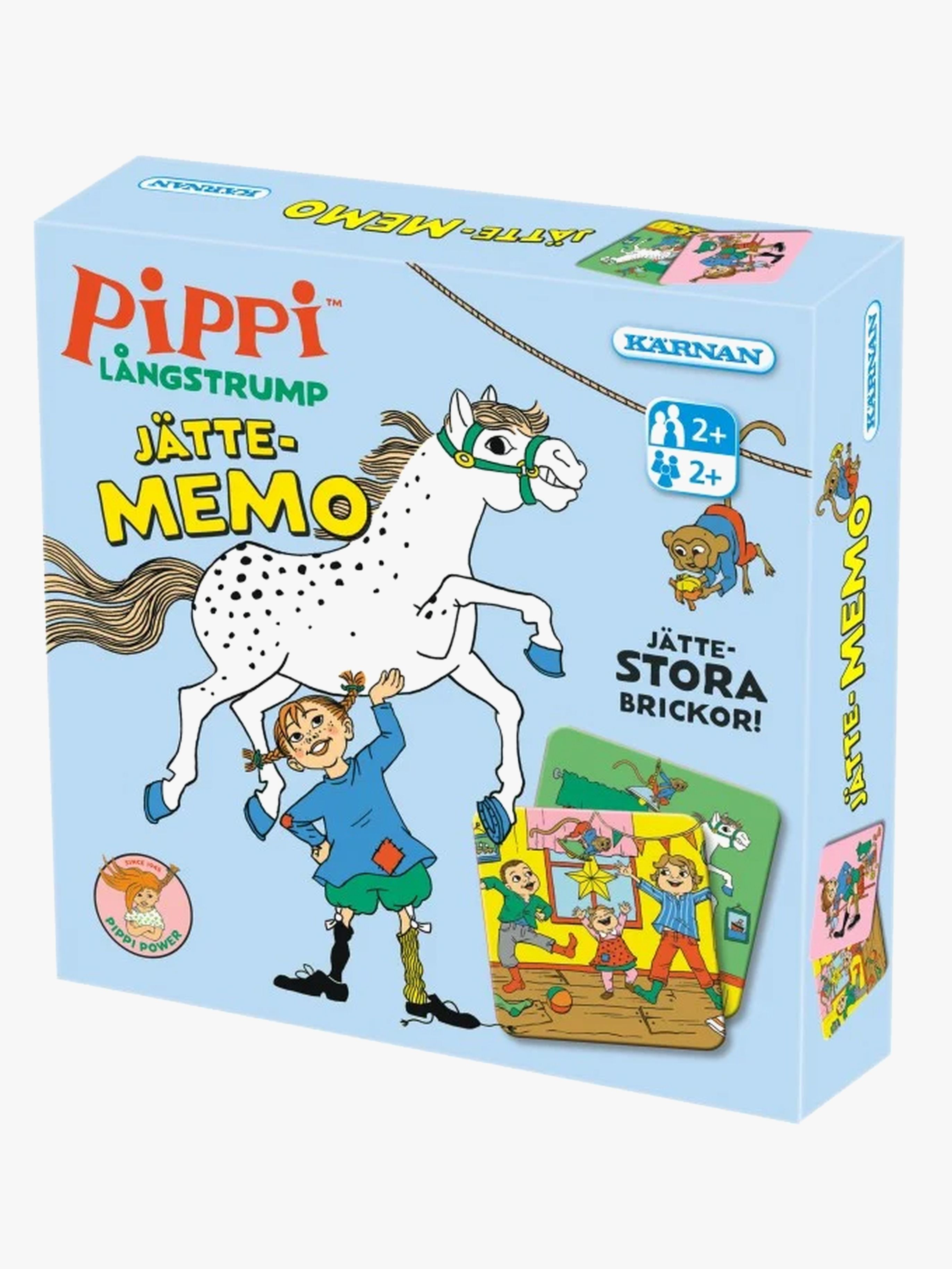 Jättememo från Kärnan med fina bilder från Pippi Långstrump. Memo med jättestora brickor spelar man bäst på golvet. Det är ett spel med enkla och tydliga bilder som passar den yngsta spelaren. Här får man både röra på sig och träna minnet, bildsinnet och lära sig att vänta på sin tur. Både roligt och lärorikt! - Jättestora brickor. - Klassiska spelregler. - Perfekt för många roliga spelstunder. - CE-märkt. - Rekommenderad ålder: Från 2 år. - Kartong.