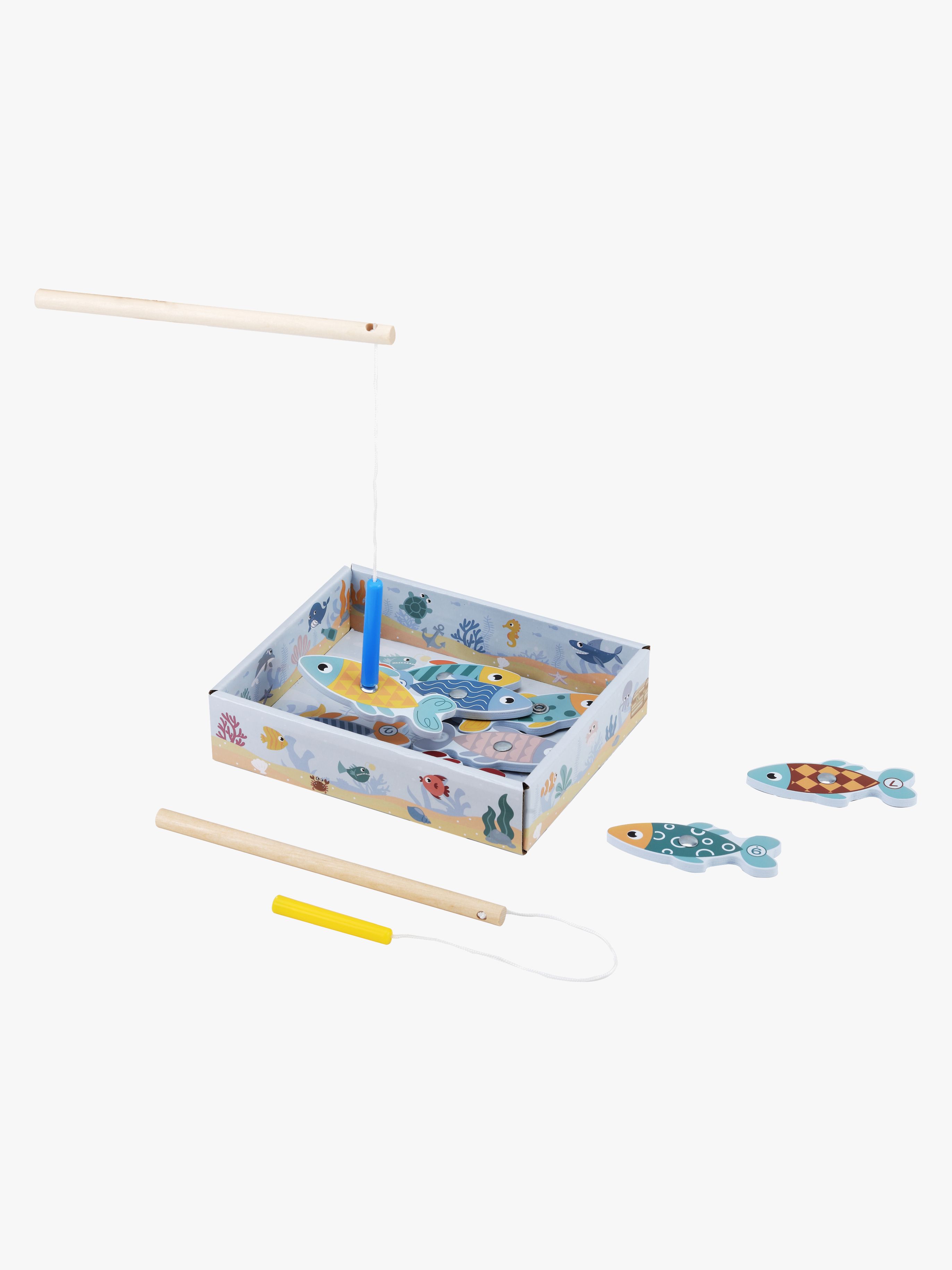 Fiskespel från Kinder and Kids med en lekfull design. Perfekt för en rolig spelkväll. - Få mest fisk på kroken. - Kommer med fisk, alla utrustade med magnet och två fiskespön med magnetkrokar. - Utvecklar precision, koordination och koncentration. - Rengörs med en fuktig trasa. - Mått: H 3,8 x B 14 x L 17 cm. - EN71- märkt. - CE-märkt. - Rekommenderad ålder: Från 2 år. - Plywood, trä, plast.