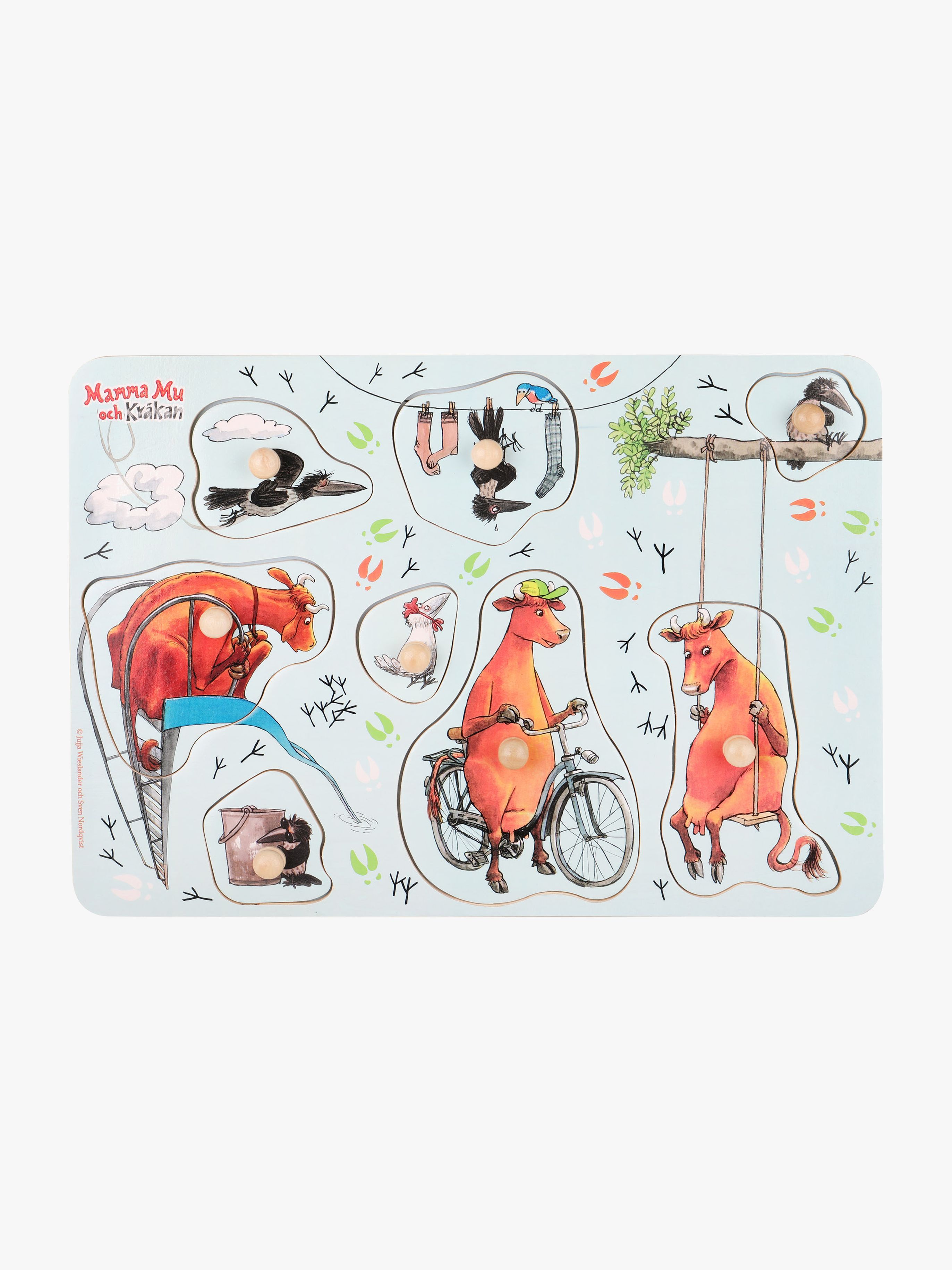 Knoppussel med roliga motiv som föreställer Mamma Mu och hennes ständige vapendragare Kråkan. Varje pusselbit har en knopp som gör att de är lättare att greppa för små händer. Pusslet är ett roligt sätt för barnet att öva på att känna igen färger och former. Rekommenderad ålder: från 1 år.