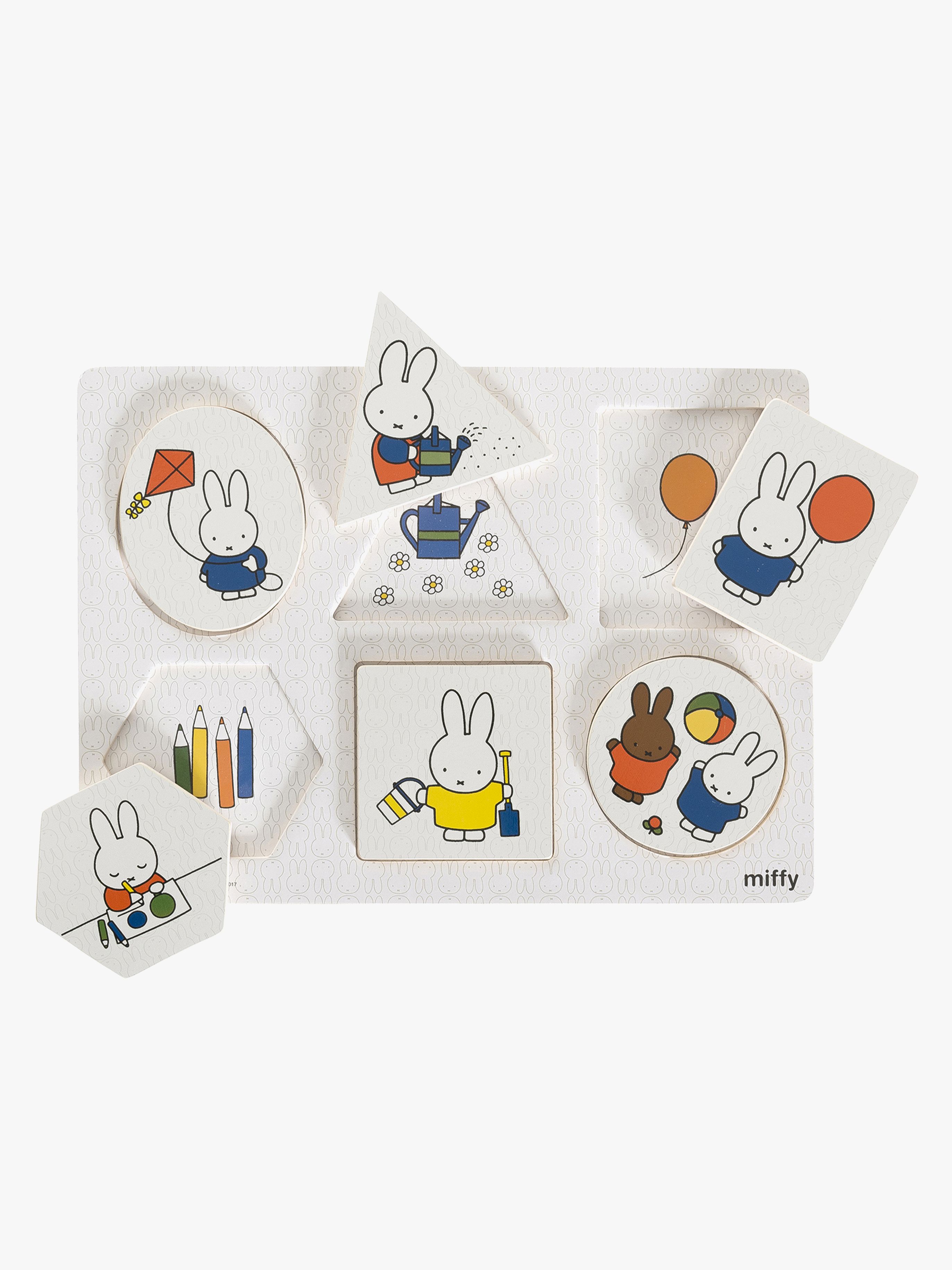 Ett roligt formpussel med den söta figuren Miffy! Pusselbitarna har olika geometriska former och motiven på pusselbitarna har alla att göra med motiven på fördjupningarna där pusselbitarna ska läggas. En roligt och lagom svårt pussel för de minsta! Rekommenderad ålder: Från 1 år. Mått: 30 x 21 cm. Material: Trä. Färg: Vit.