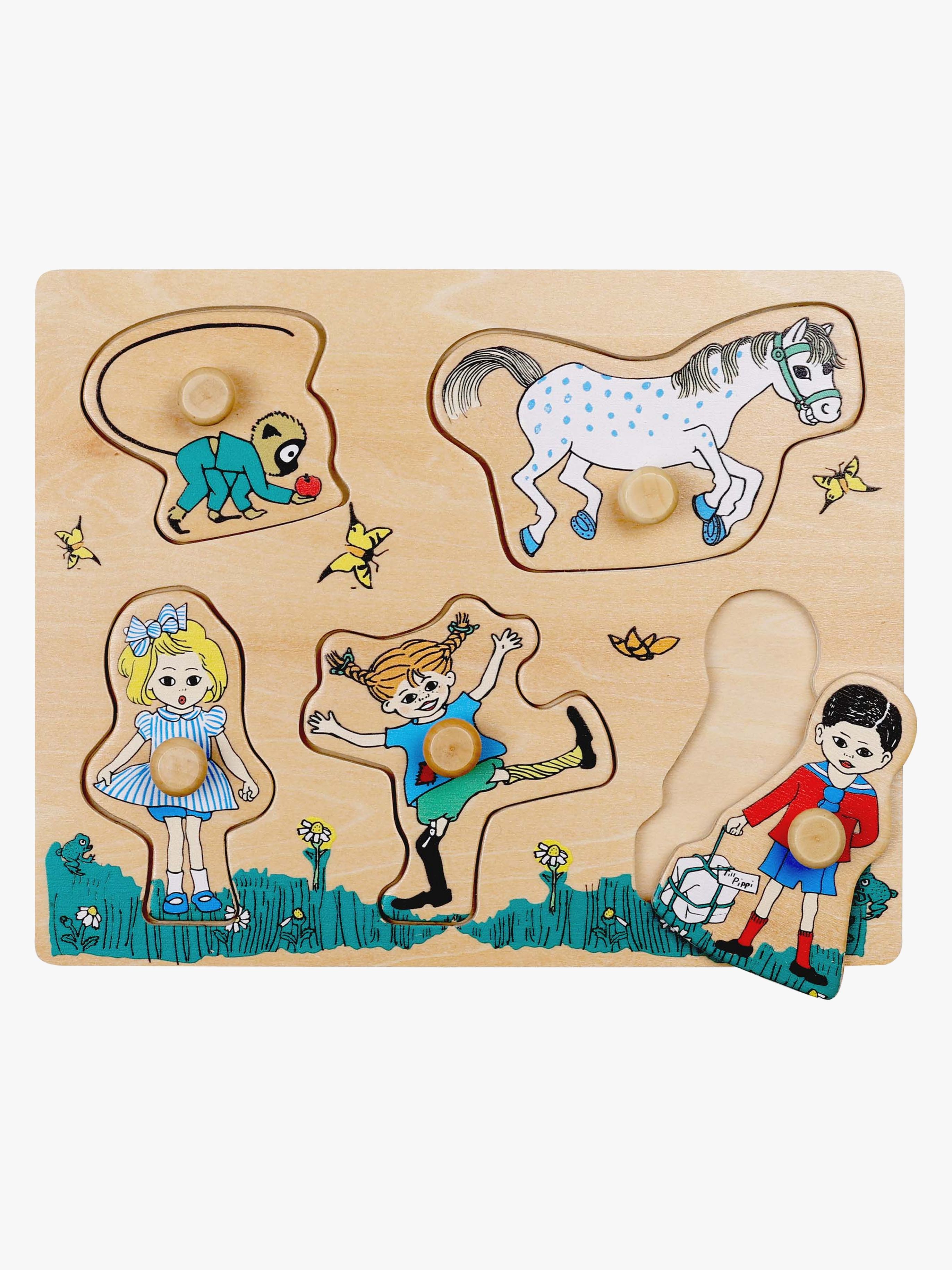 Knoppussel från Pippi med ett lekfullt motiv med karaktärer från Pippi Långstrump. Perfekt för att träna ditt barns hand-öga-koordination och finmotorik. - 5 Bitar. - Lätta att greppa för små händer. - Färgglada motiv. - Perfekt för att utveckla finmotoriken. - CE-märkt. - Rekommenderad ålder: Från 1,5 år. - Plywood, plast.