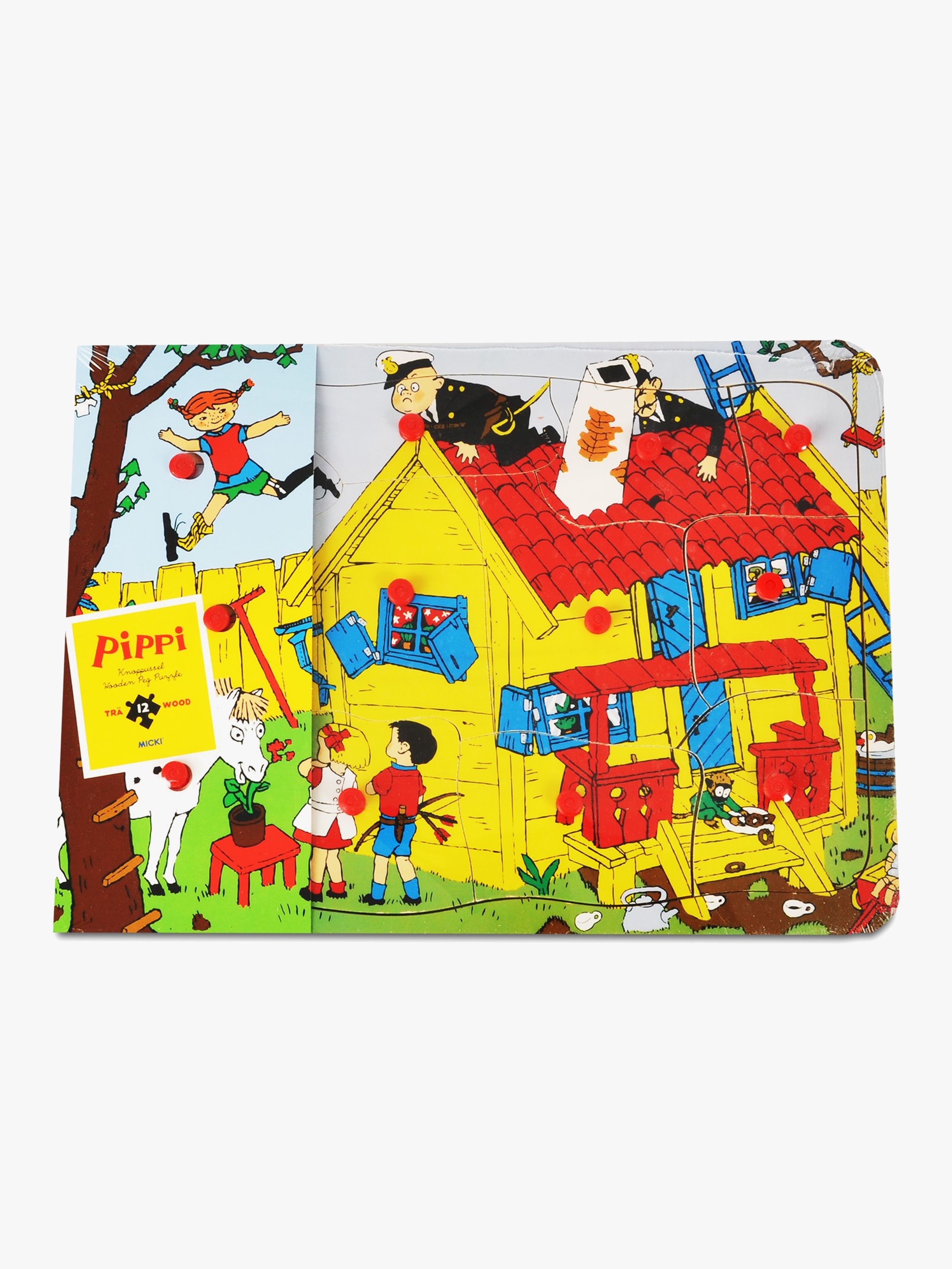 Ett färgglatt knoppussel i trä med tolv bitar och fint motiv av Pippi och Villa Villekulla. Lägg ihop pusslet bit för bit och se hur Pippi och hennes vänner växer fram. Pusselbitarna har små knoppar att hålla i och läggs i en ram, vilket ger ditt barn lite hjälp på traven. Illustration gjord av Ingrid Vang Nyman. Ett fint och roligt pussel för alla som gillar Pippi! Rekommenderad ålder: Från 18 månader.