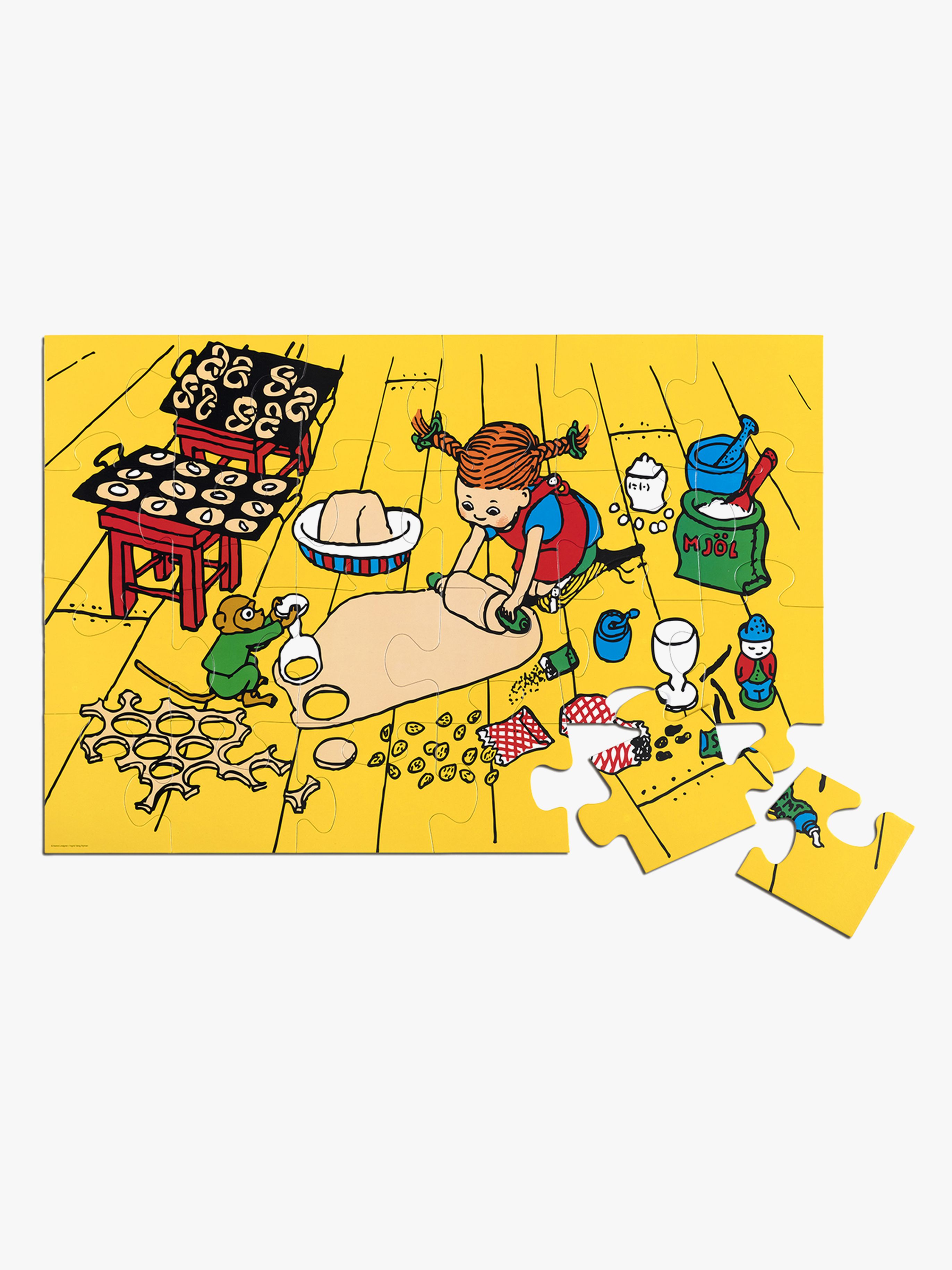 Det här är ett roligt pussel med Pippi Långstrump, med en klassisk illustration av Ingrid Vang Nyman. Pusslet är så stort att du måste pussla det på golvet! Eftersom bitarna är så stora blir pusslet extra kul att lägga tillsammans. När alla 24 bitarna är på plats ser du Pippi Långstrump och Herr Nilsson som är i full gång med att baka, på golvet så klart! Rekommenderad ålder: Från 3 år. Antal bitar: 24 st. Mått: 92 x 62 cm. Material: Papp.