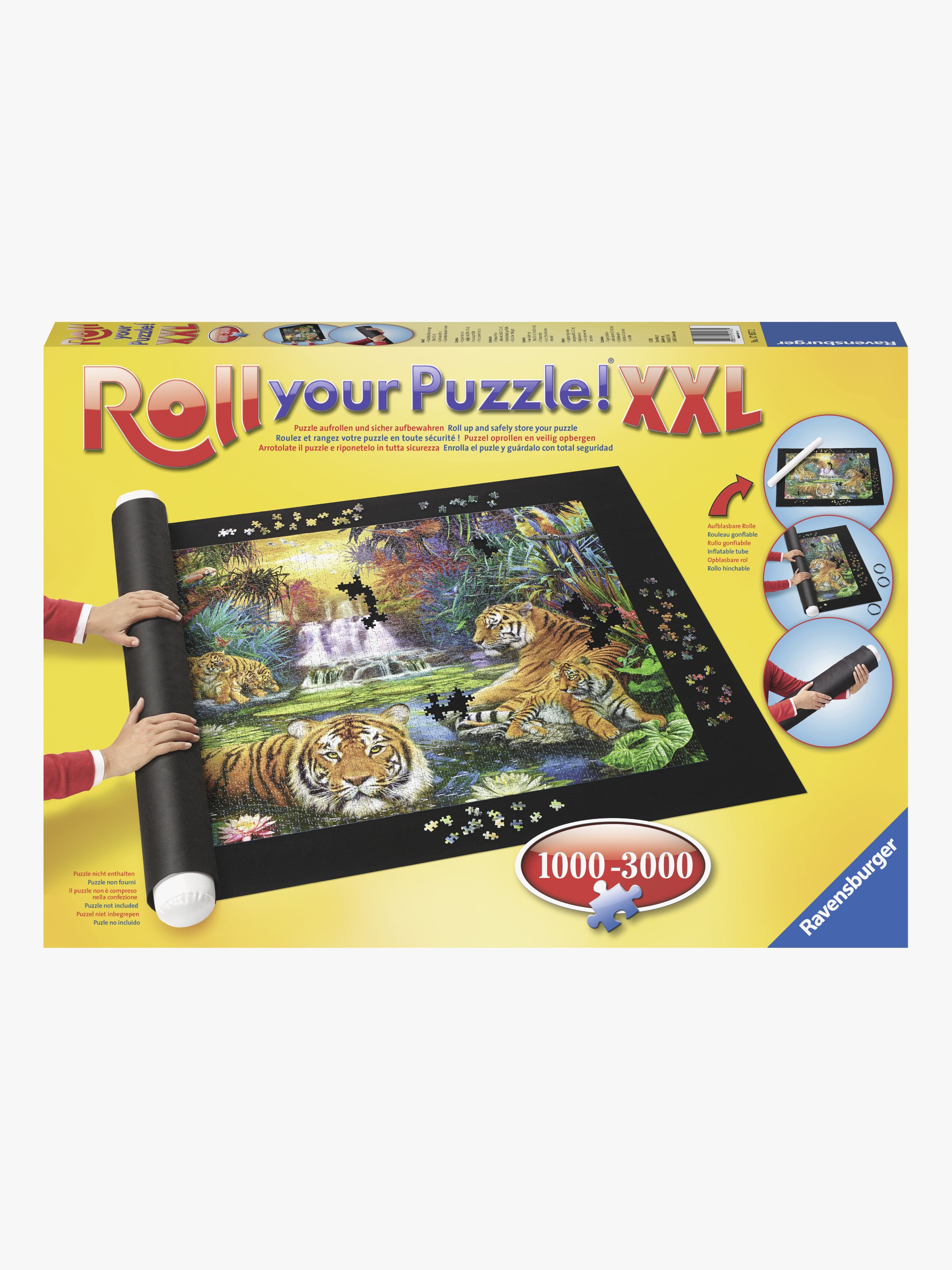 Pusselmatta XXL från Ravensburger för pussel med 1000 till 3000 bitar. Pussla direkt på den glidskyddade filtmattan och förvara det enkelt genom att blåsa upp plaströret, rulla ihop mattan runt det med pusselsidan vänd inåt och säkra den med gummiband. Smart förvaring av pusslet när du inte pusslar! Innehåll: Filtmatta med glidskydd, uppblåsbart rör och tre gummiband. Rekommenderad ålder: Från 14 år.