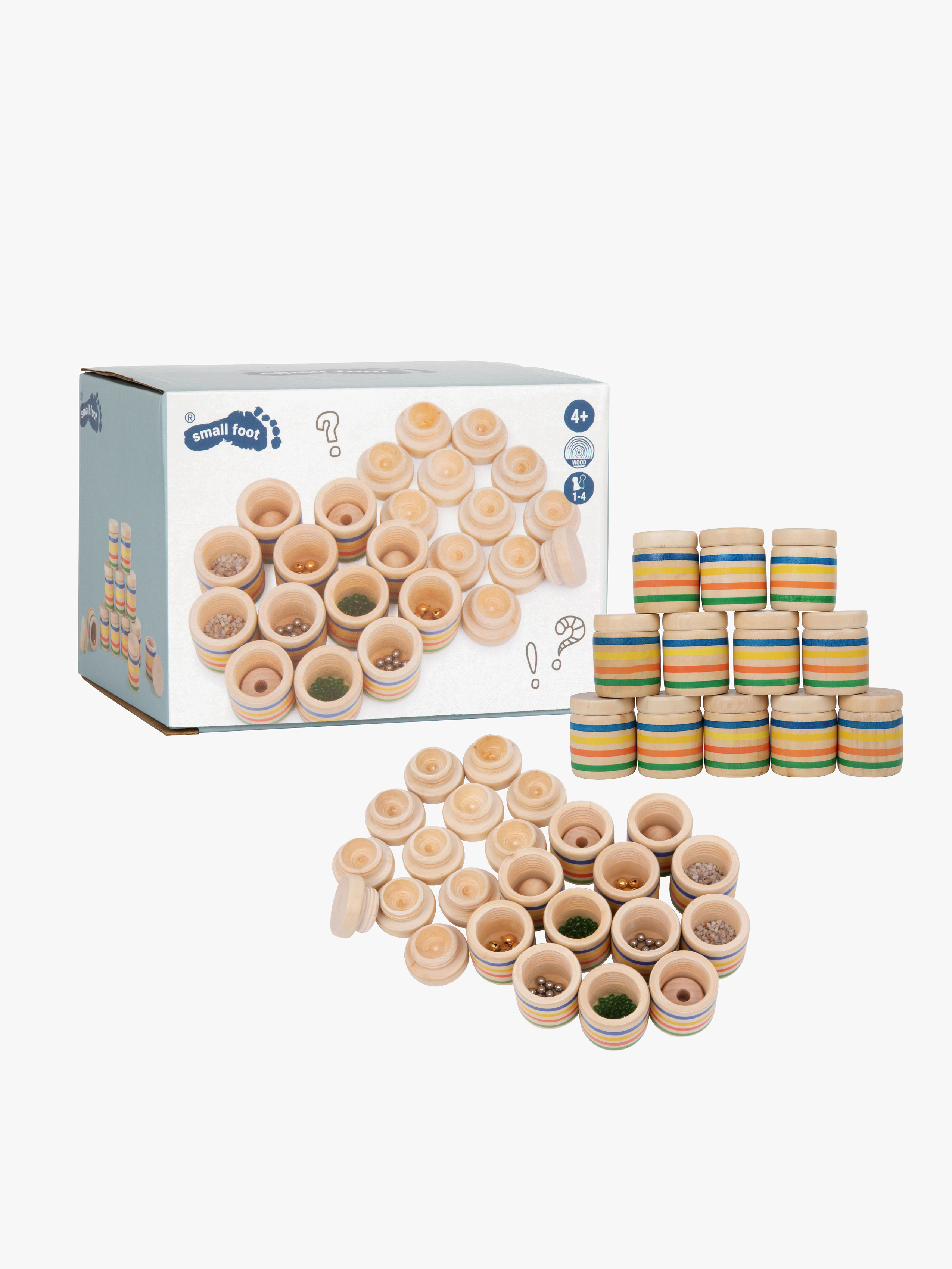 Sensoriskt memo från Small Foot. Perfekt för att träna tålamod, öga-hand-koordination och minne. - Antal delar: 12. - Delarna är fyllda med olika material som låter olika när man skakar dem. - Behållarna kan även fyllas med andra objekt tack vare de avtagbara locken. - Lätta att greppa för små händer. - Kan spelas ensam eller tillsammans med vänner och familj. - Perfekt för taktil lek och sensorisk stimulans. - CE-märkt. - Rekommenderad ålder: Från 4 år.