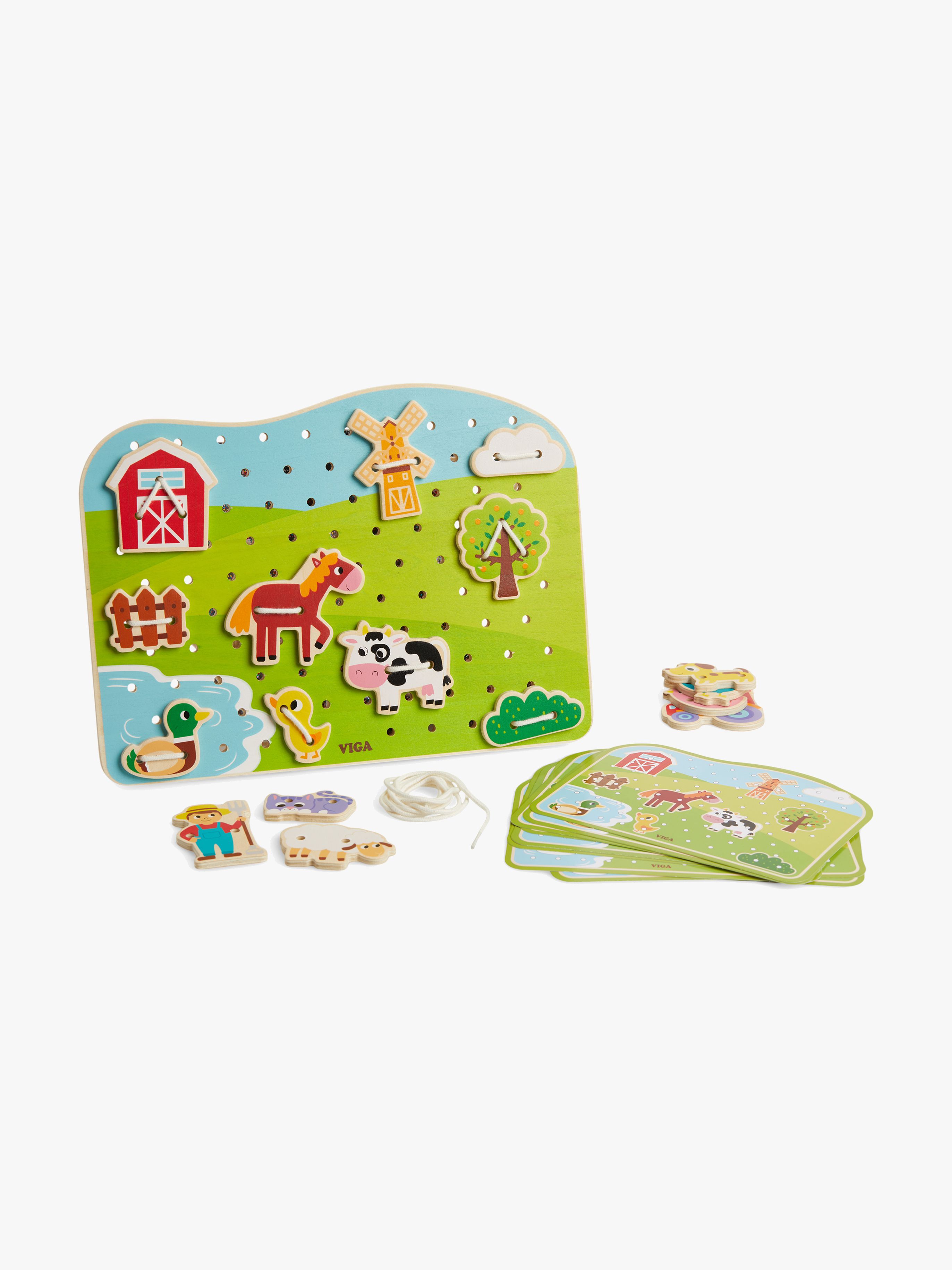 Aktivitetsleksak från VIGA med flera roliga lekfunktioner i trä. Innehåller en lekbräda i trä, 20 trådbara brickor, 3 trådar och 10 mallar som visar olika sätt att trä in tillbehören på brädan. Perfekt för att träna ditt barns hand-öga-koordination och finmotorik. - Placera figurerna på brädan och sätt fast med snöret. - Bondgårdstema. - Färgglada motiv. - CE-märkt. - Rekommenderad ålder: Från 1,5 år. - Trä, bomull.