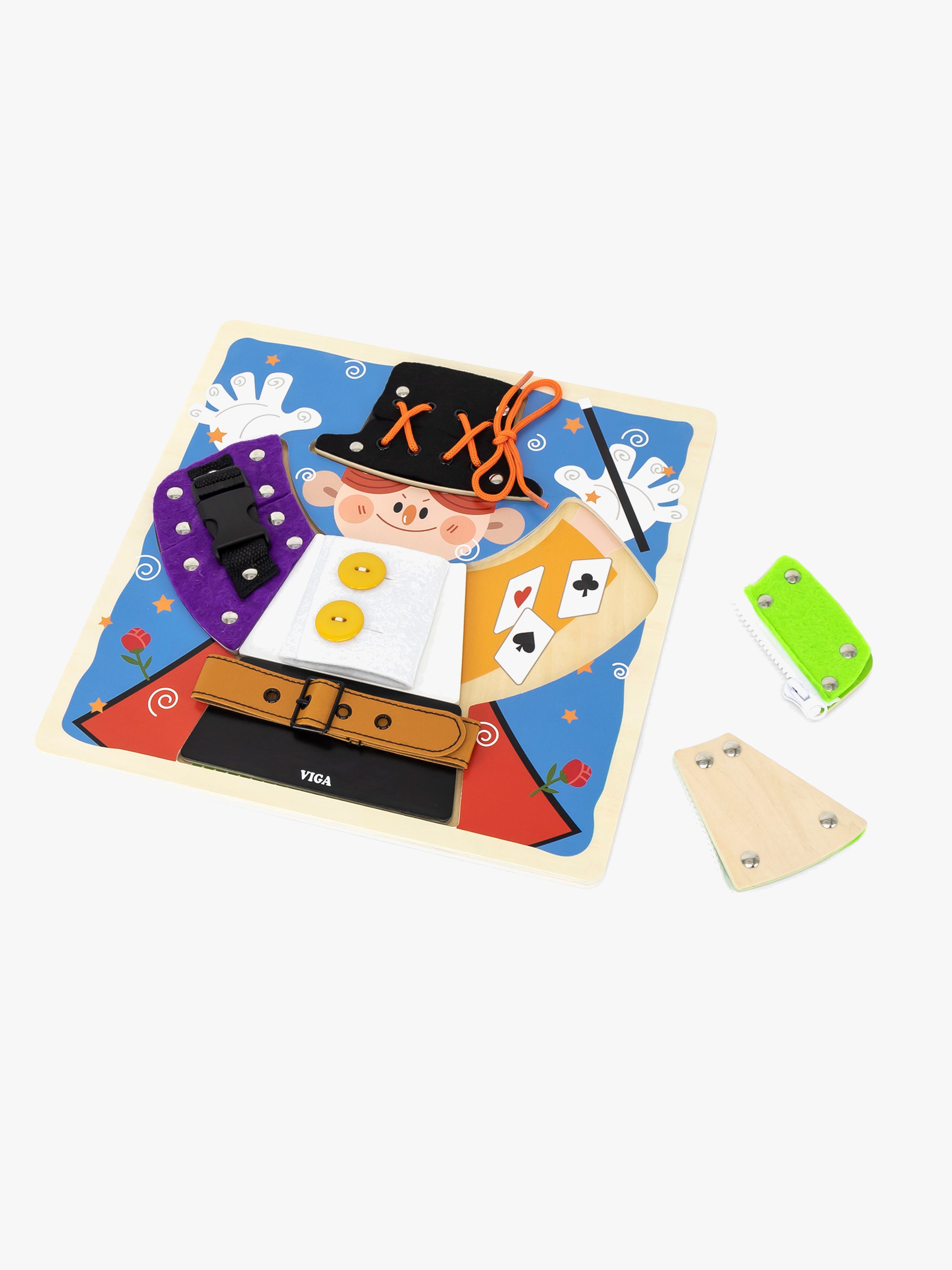 Aktivitetstavla från VIGA i trä med flera roliga, lärorika funktioner. Hjälp den lilla trollkarlen att klä sig och öva på din klädförmåga med knappar, dragkedja, spänne, spets och bälte. Varje färdighet är fäst på en separat, avtagbar träpusselbit för enkel övning. Ta loss bitarna och hitta små överraskningar gömda under. Perfekt för att öva ditt barns finmotorik. – CE-märkt. – Rekommenderad ålder: Från 1,5 år. – Trä.