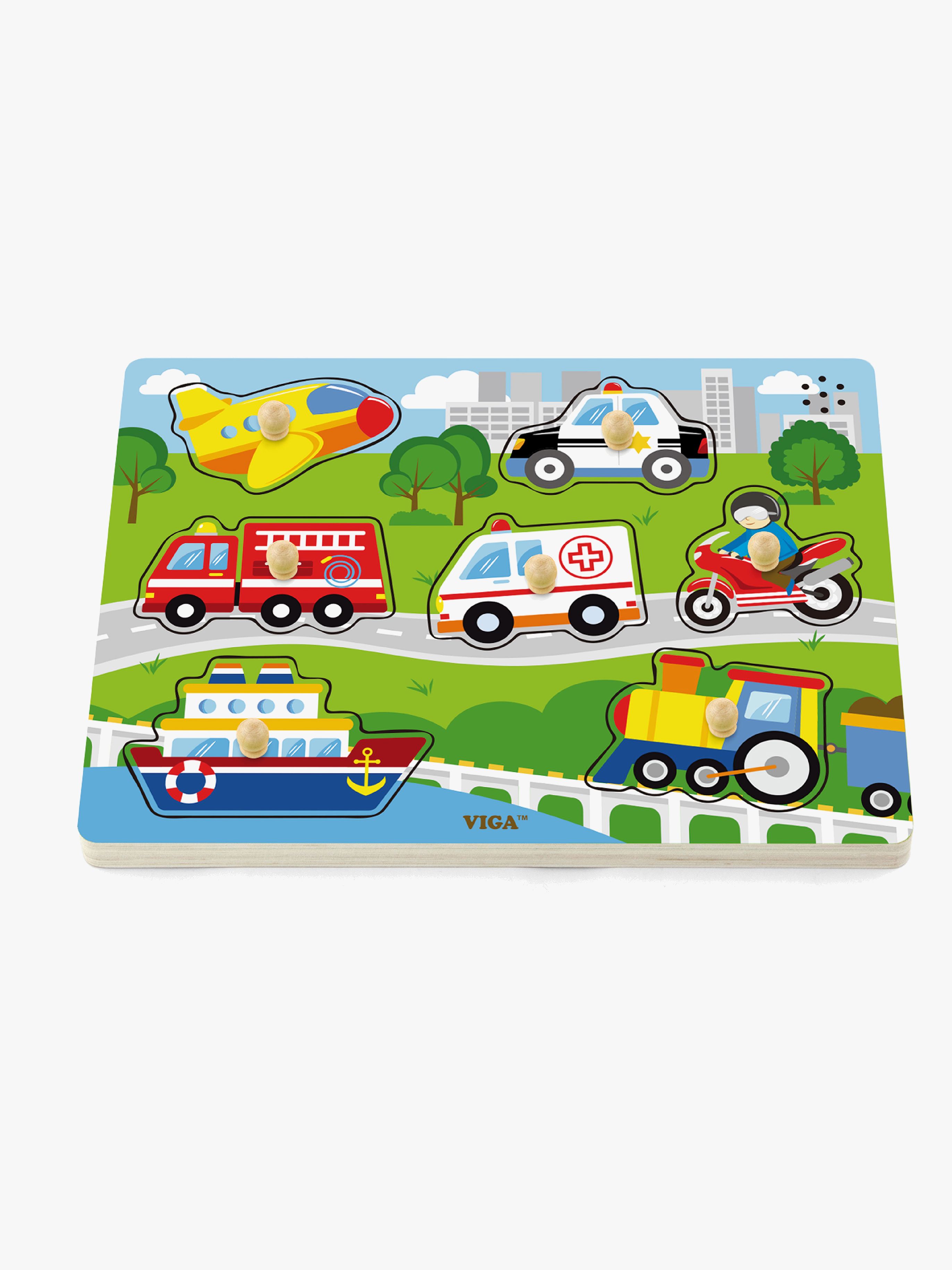 Med det här roliga pusslet från VIGA kan barnet lära sig om olika fordon och hur de låter. Sätt en pusselbit på rätt plats i pusslet och du får höra ljud från fordonet. En perfekt leksak för att träna barnets kunskaper och koordination. Rekommenderad ålder: från 18 månader.